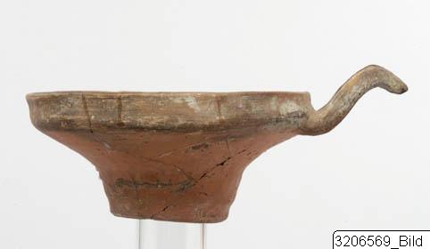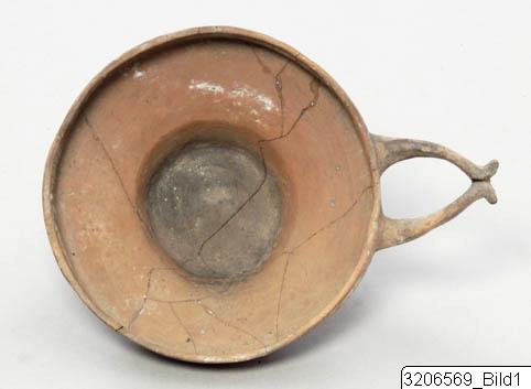 - Angular profile. Large, arched fork-handle. Low base-ring. Brown clay, matt slip. Mottled surface varying from red to black.
