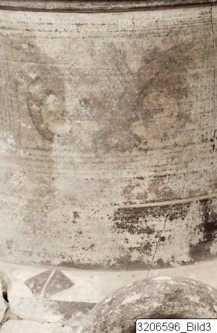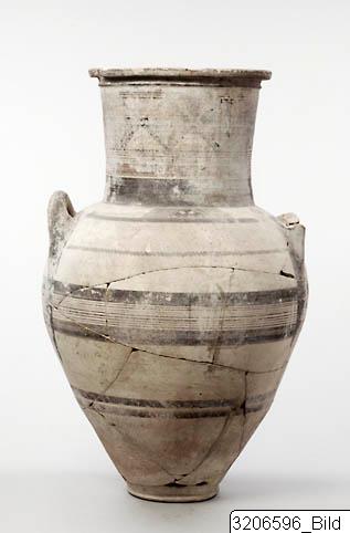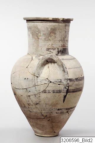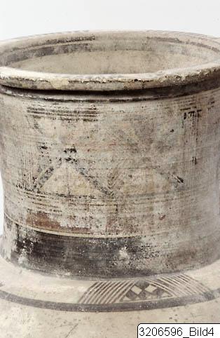 - Ring-base. Ovoid body. High, wide, concave neck. Horizontal mouth. Ridge encircling upper neck. Round horizontal handles on shoulder. Black band and black line encircling inside neck. Five groups of black, transverse strokes on rim. Side of rim and ridge painted black. Black winged concentric lozenges, with black chequers inside, on either side of mid-neck, framed by lotus-ornament in red and black. Black, filled triangles, black panels and black, vertical zigzag line on either side of central ornament. Black band encircling neck-base.. Triangular, black chequers, framed by black, diagonal panels and two black, filled triangles on either side of shoulder. Lotus ornament in red and black on either side of shoulder, above handles. Wavy line in black encircling lower shoulder. Nine black lines, framed by bands, encircling mid-body. Two black bands encircling lower body. Handles painted black. Light buff clay. Matt buff slip. Matt brownish red and greyish black paint.