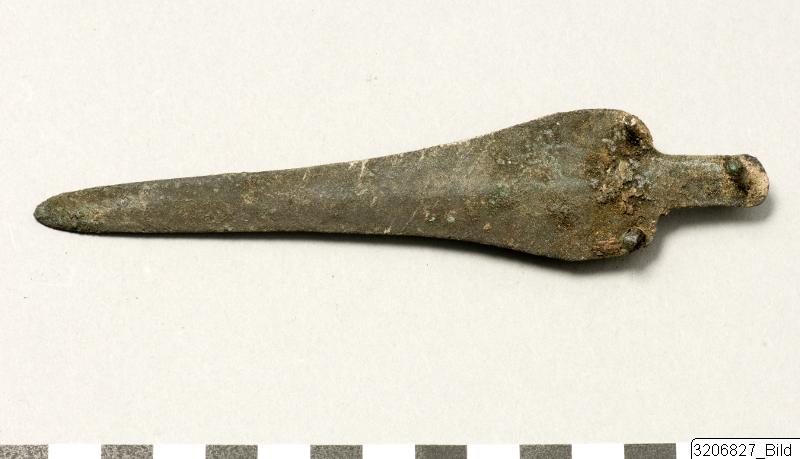 - Leaf-shaped. Two edges. Mid-rib. Concave sides. Curved top. Short, flat tang with three rivets.