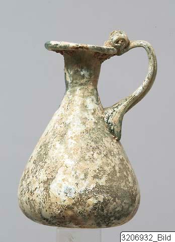 - Splayed mouth. Short neck, widening towards the top. Rounded raised handle from rim to shoulder, knob at the top. Pear-shaped body. Flat base. Green glass.