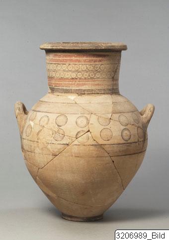 - Base-ring. Ovoid body. Wide, straight, slightly splaying neck with thick, flat rim. Horizontal handles on shoulder. Decoration of red and black encircling lines and bands and concentric circles. Base, rim and handles painted black.