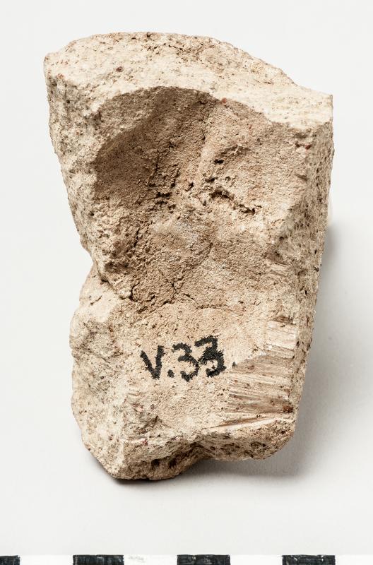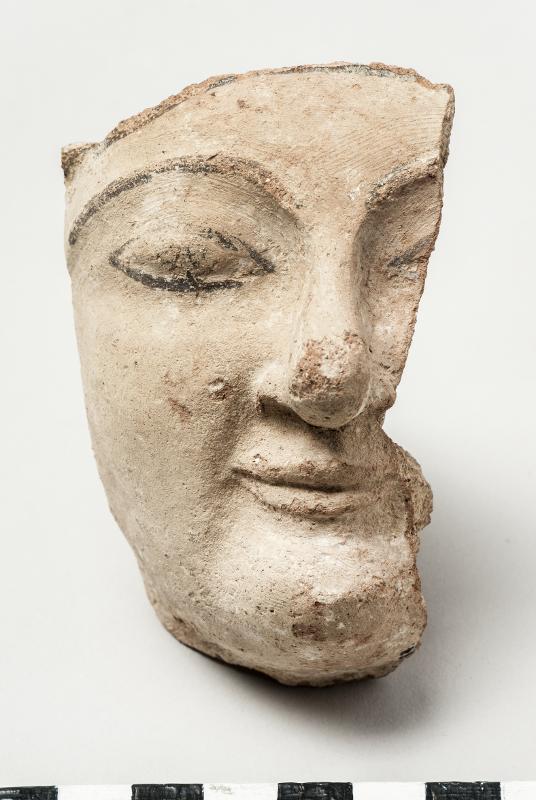 - Rounded, protruding chin. Smiling, puckered lips. Full cheeks. Large nose. Almond-shaped eyes. Hairline, eyebrows, iris and outline of eyes painted black. Brick clay, buff slip.