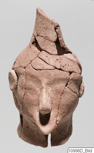 - Head from hollow statuette. Eyebrows and eyeballs indicated. Pellet ears. Pinched nose. Triangular, pointed beard. Short helmet with open spike. Red-brown clay. Light slip.