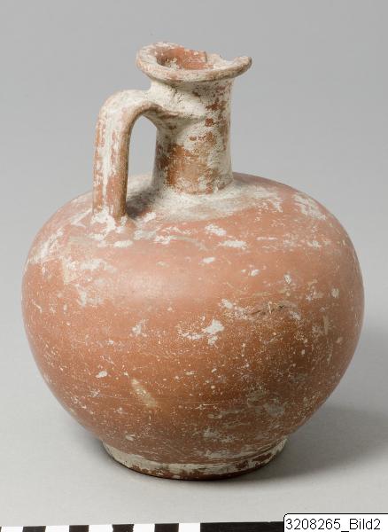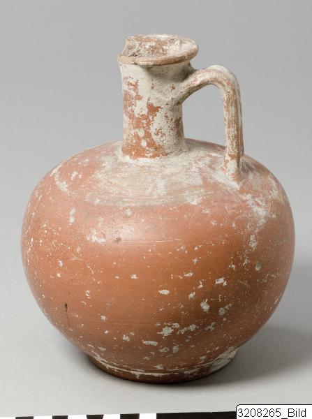 - Out-turned rim. Narrow, almost straight neckvertical handle from neck to shoulder. Globular, depressed body. Base-ring. hard, buff clay, red polish.