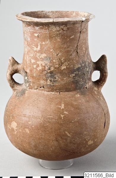 - Flat rim. Wide, cylindrical neck. Squat body with round base. Two knobbed handles from neck to shoulder. Incised, straight and wavy lines around rim, neck and shoulder. Buff clay.