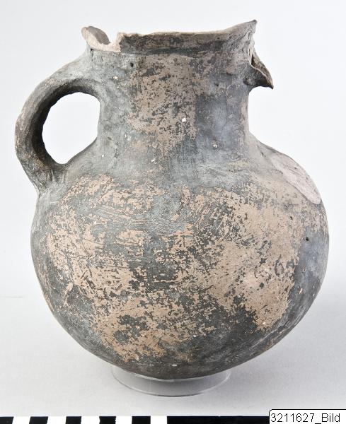 - Splayed rim. Wide, cylindrical neck. Two opposed handles (one missing) from neck to shoulder. Globular body. Round base. Grey, brown clay. Black slip.