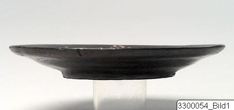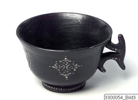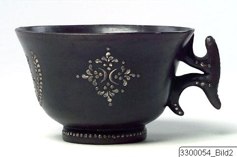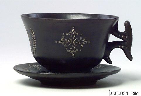 - Cup, flaring and the concave sides, straight rim, low foot. Saucer, low flaring sides, flattened rim, low foot. Both, reddish brown paste, dark brown glaze and flower motif inlaid with silver.