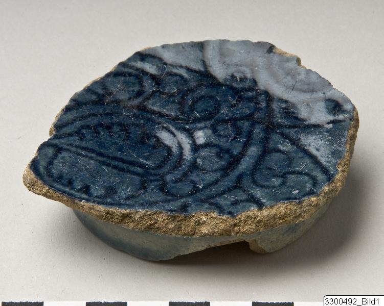 - Buff monochrome glaze ware. Incised floral scroll decoration under blue glaze.