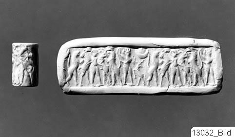 - Cylinder seal with vertical bore. Engraving in low relief depicting frieze of male figures and animals. Above the scene a crescent. White stone.