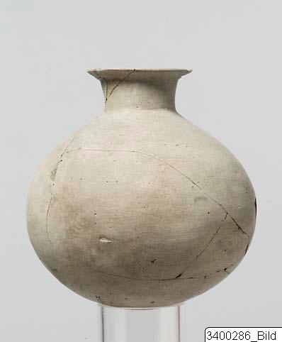 - Grey polished, globular bottle with round base. The almost cylindrical neck is slightly splayed and provided with a wide splayed rim.