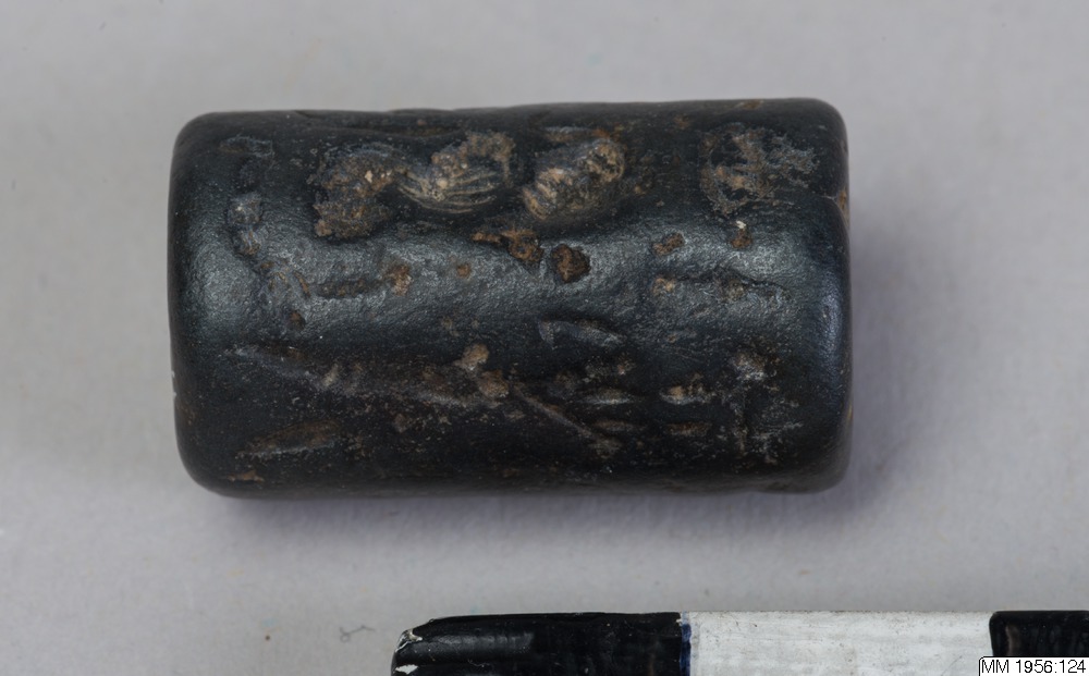 - Cylinder seal with vertical bore. Engraving in low relief depicting three standing figures, a griffin, a quadruped with long, curved horns and a moon crescent. Black, polished hematite.