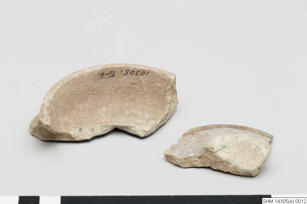 - 2 base fragments of glazed pottery, one is yellowish, the other greenish.