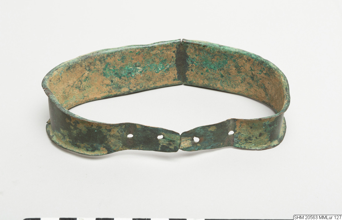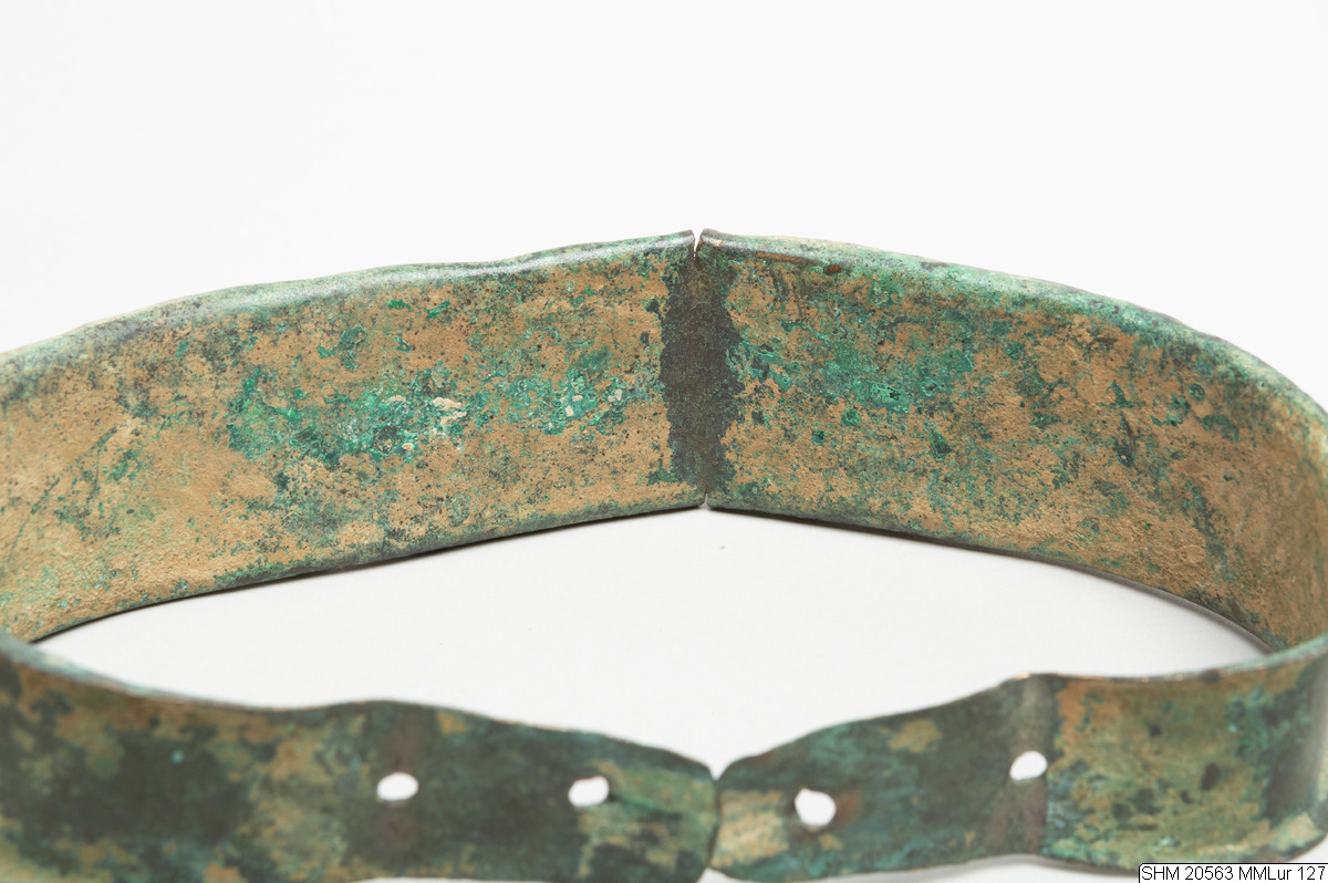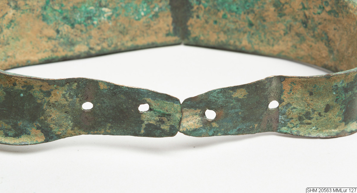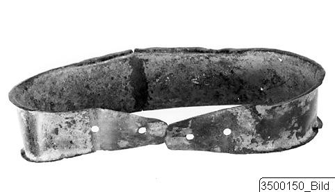 - Sheet metal band. Circle with edges folded at right angle to band as flanges. Narrows at ends, each of which has two holes punched from front side.