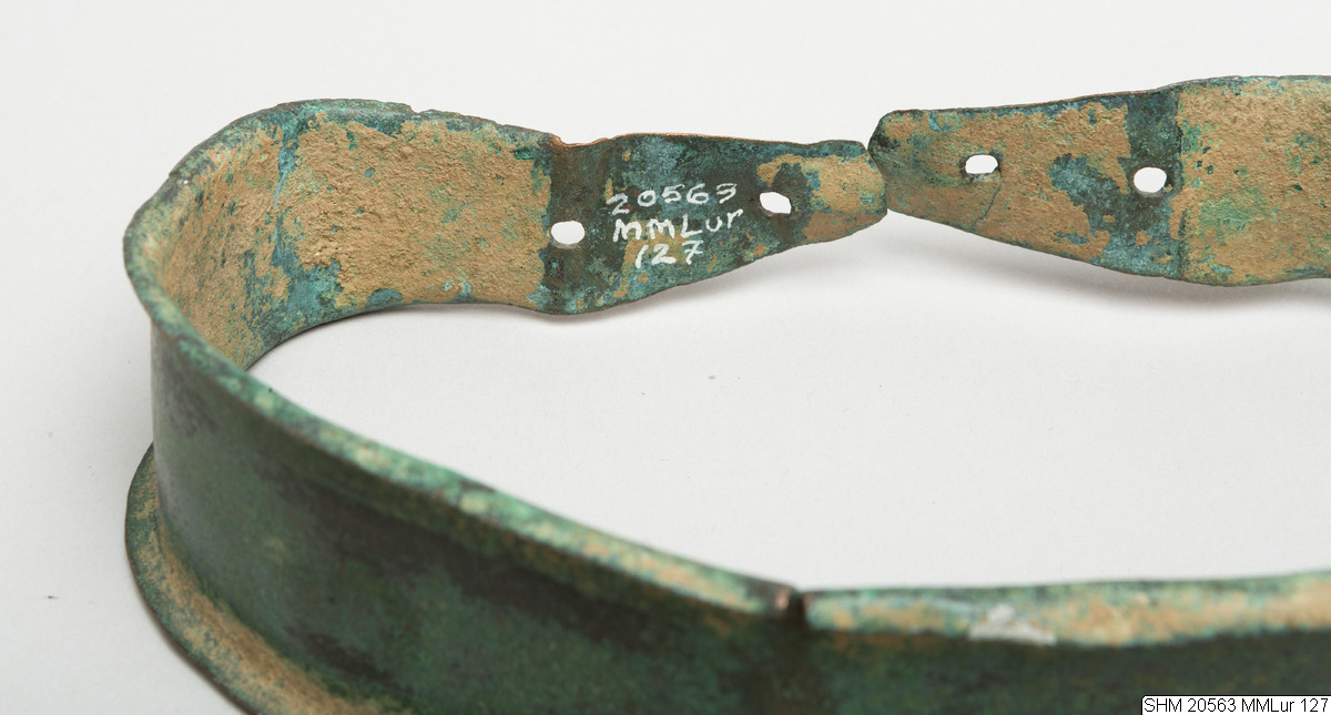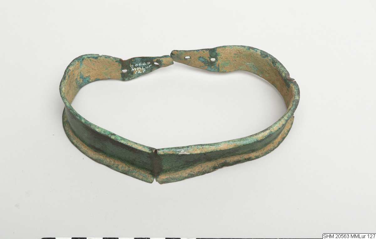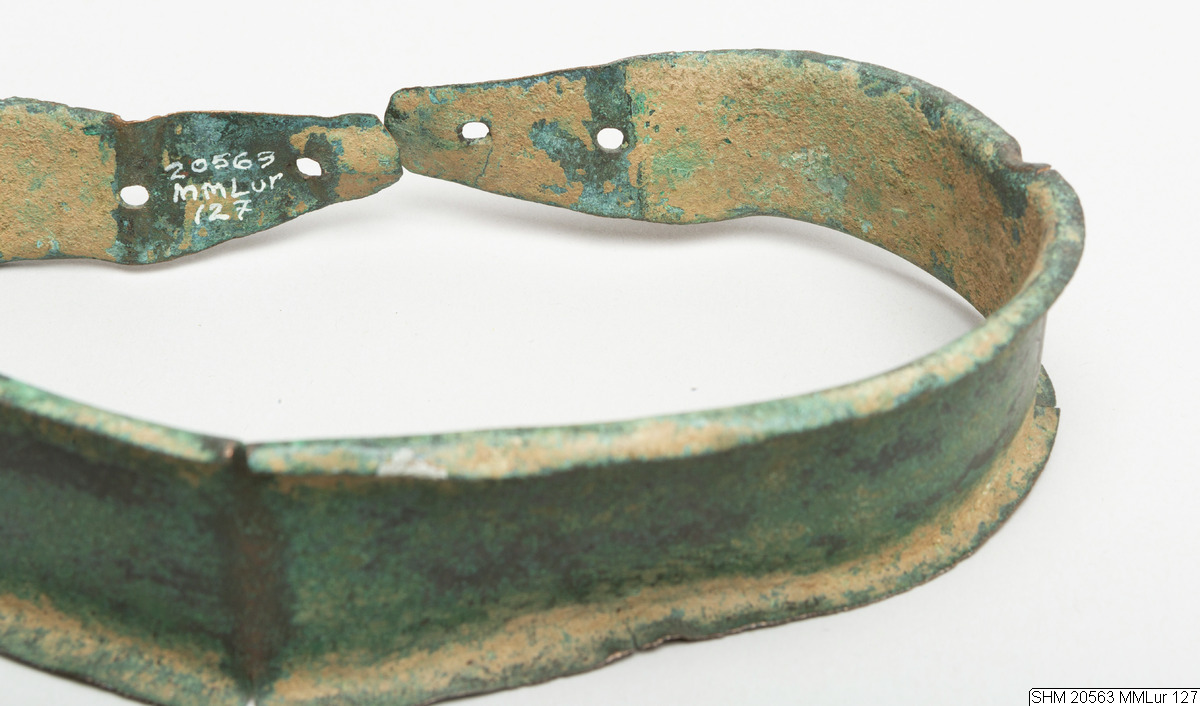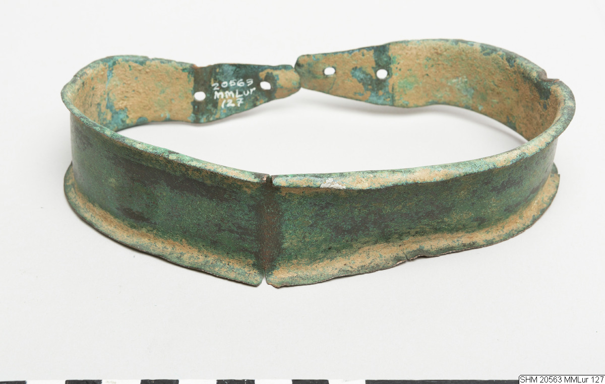 - Sheet metal band. Circle with edges folded at right angle to band as flanges. Narrows at ends, each of which has two holes punched from front side.