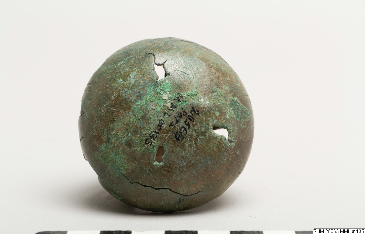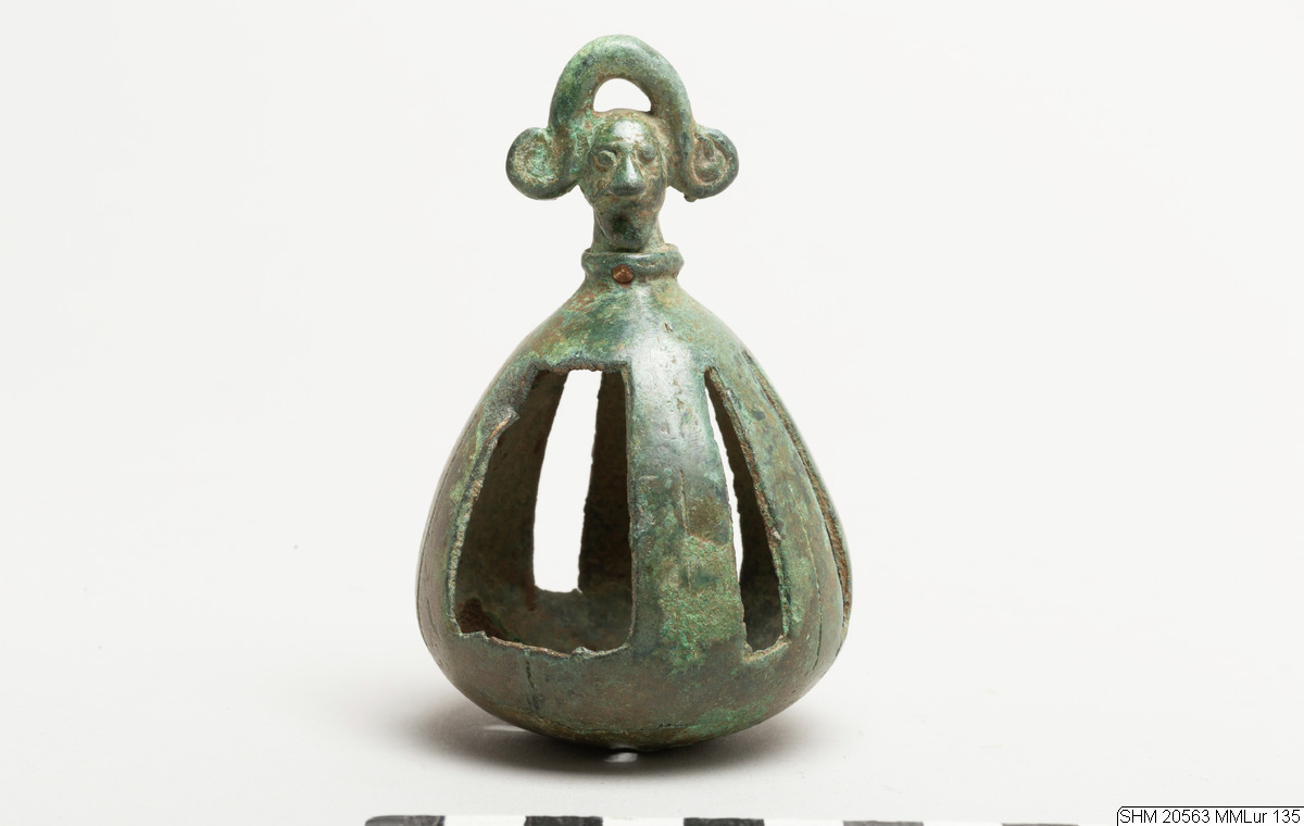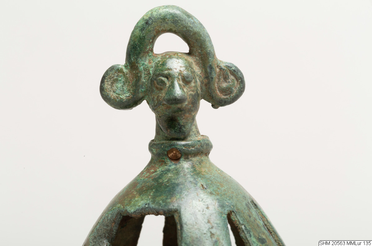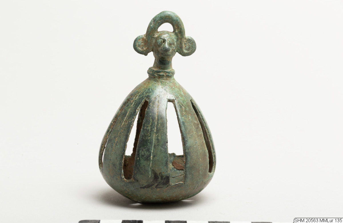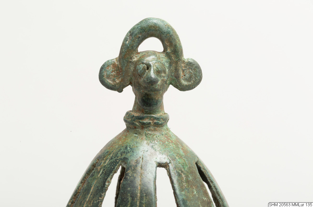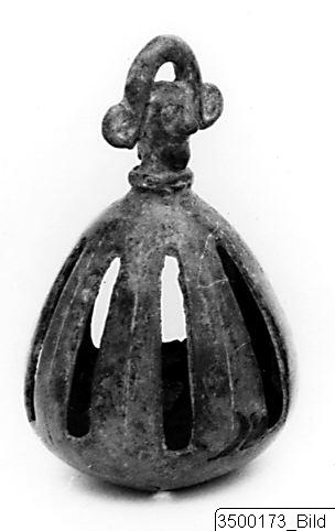 - Cast. Egg-shaped cage, flat broad vertical ribs, each tapering toward top and with incised central line. At the top a bearded head with suspension loop as coiffure ending in spirals at ear level.