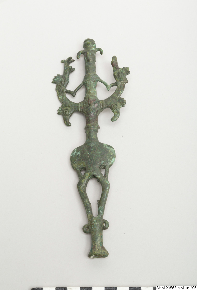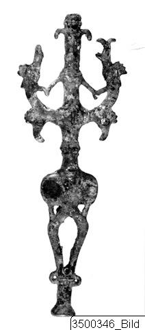 - Cast. Master of animals: anthropomorphic tube flanked by rampant animals. Two human faces on the tube, one at the top with "turban" (three ringed moulding) and large droop ears, and one at the center, both with prominent noses. Central figure with spindly arms sharply bent at elbows grasps the necks of the flanking beasts. Decor: double band necklace for top figure, double ridged moulding flares outward at waist of second figure. Beasts have long branching snouts (one broken), roosters' combs, long curving necks, and at the “elbows” pendant roosters' heads with downward curving beaks. Plain haunches, long tails curved over into loops at bottom / three rings around shaft for feet? Long base widens at bottom.