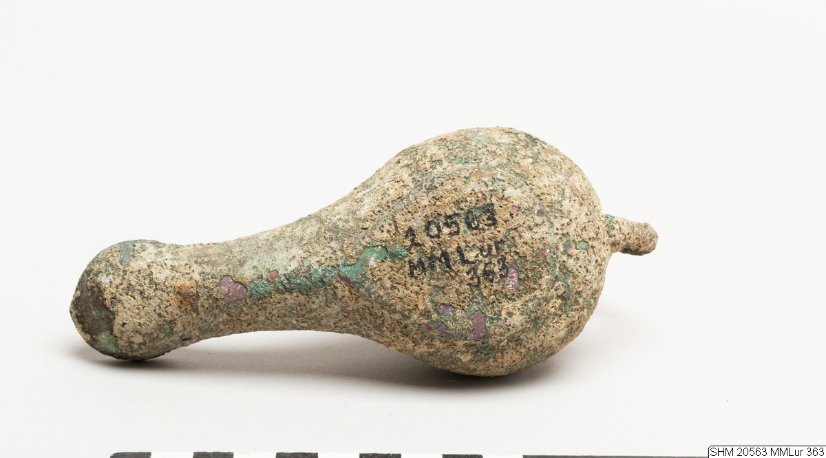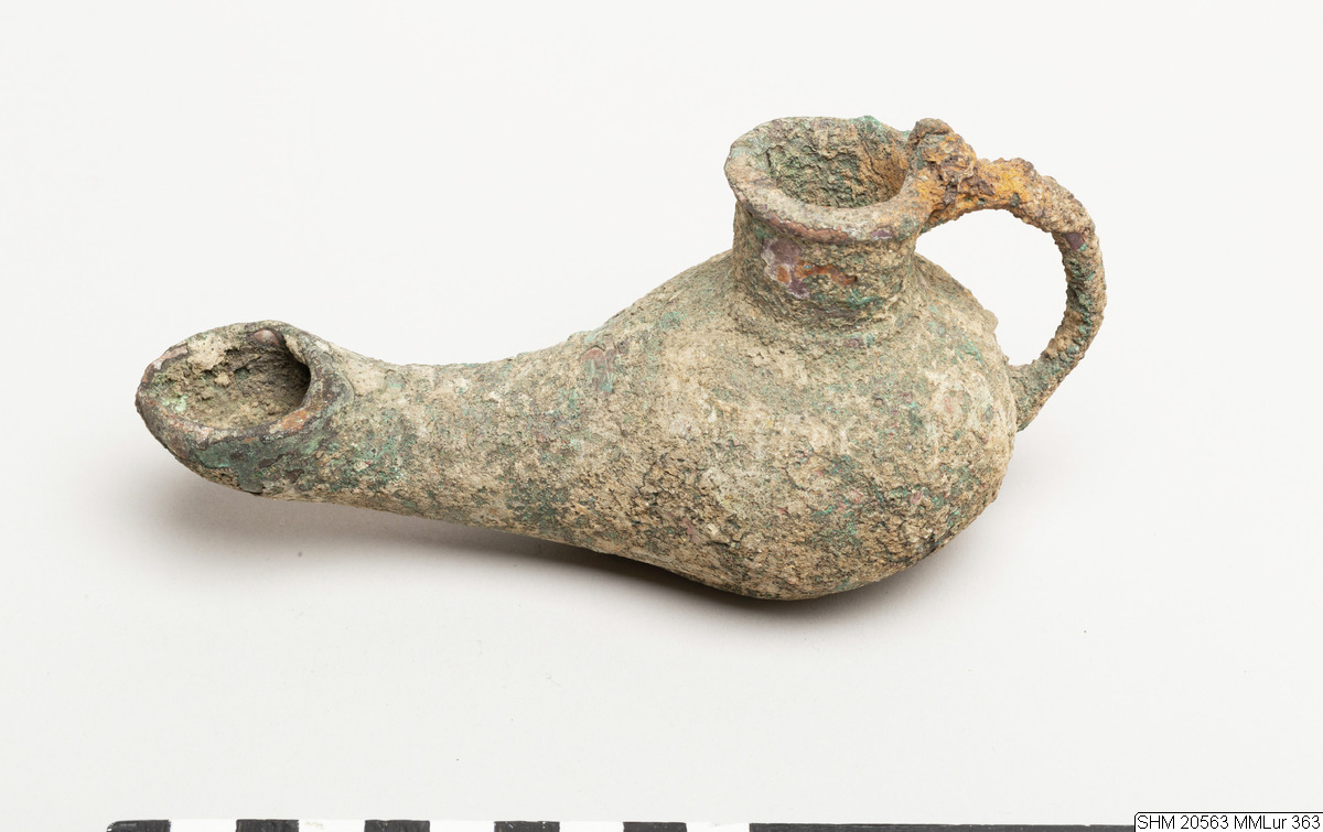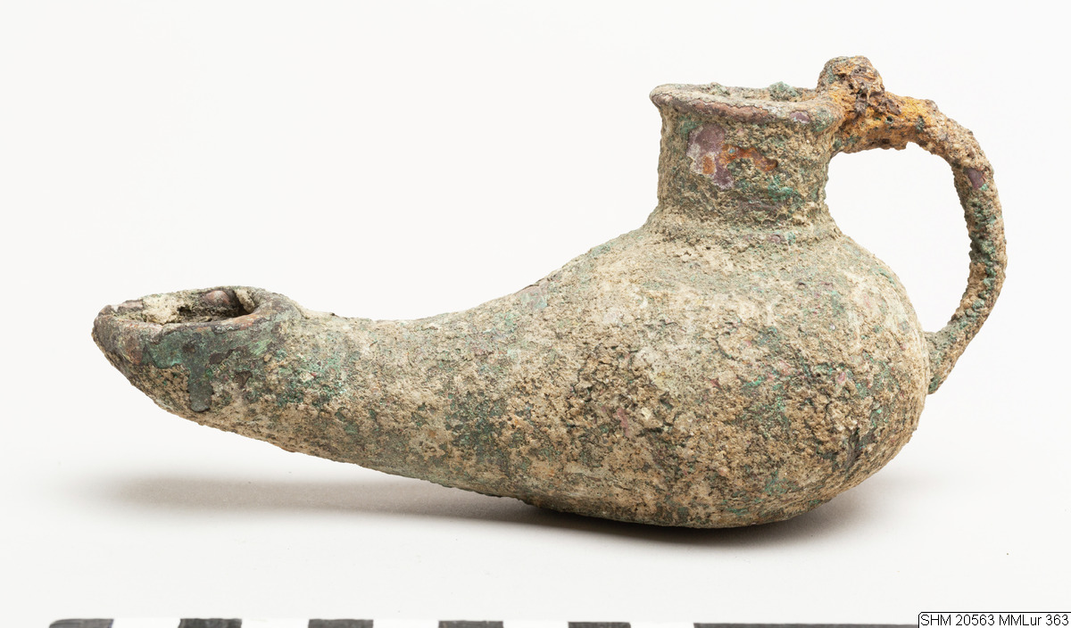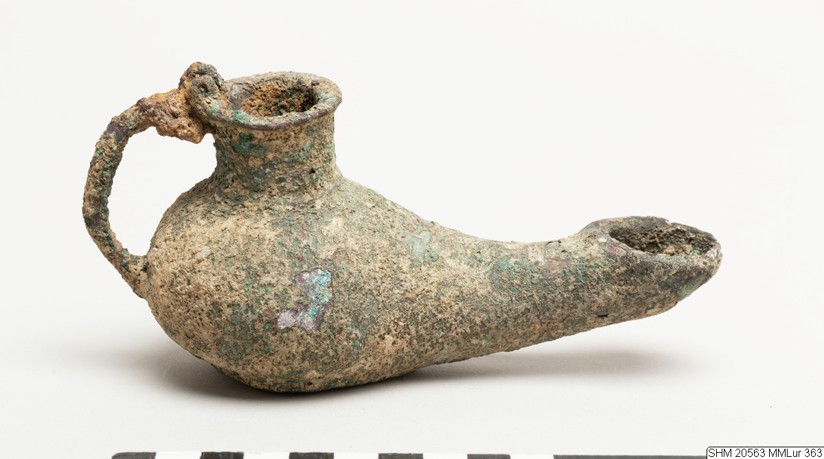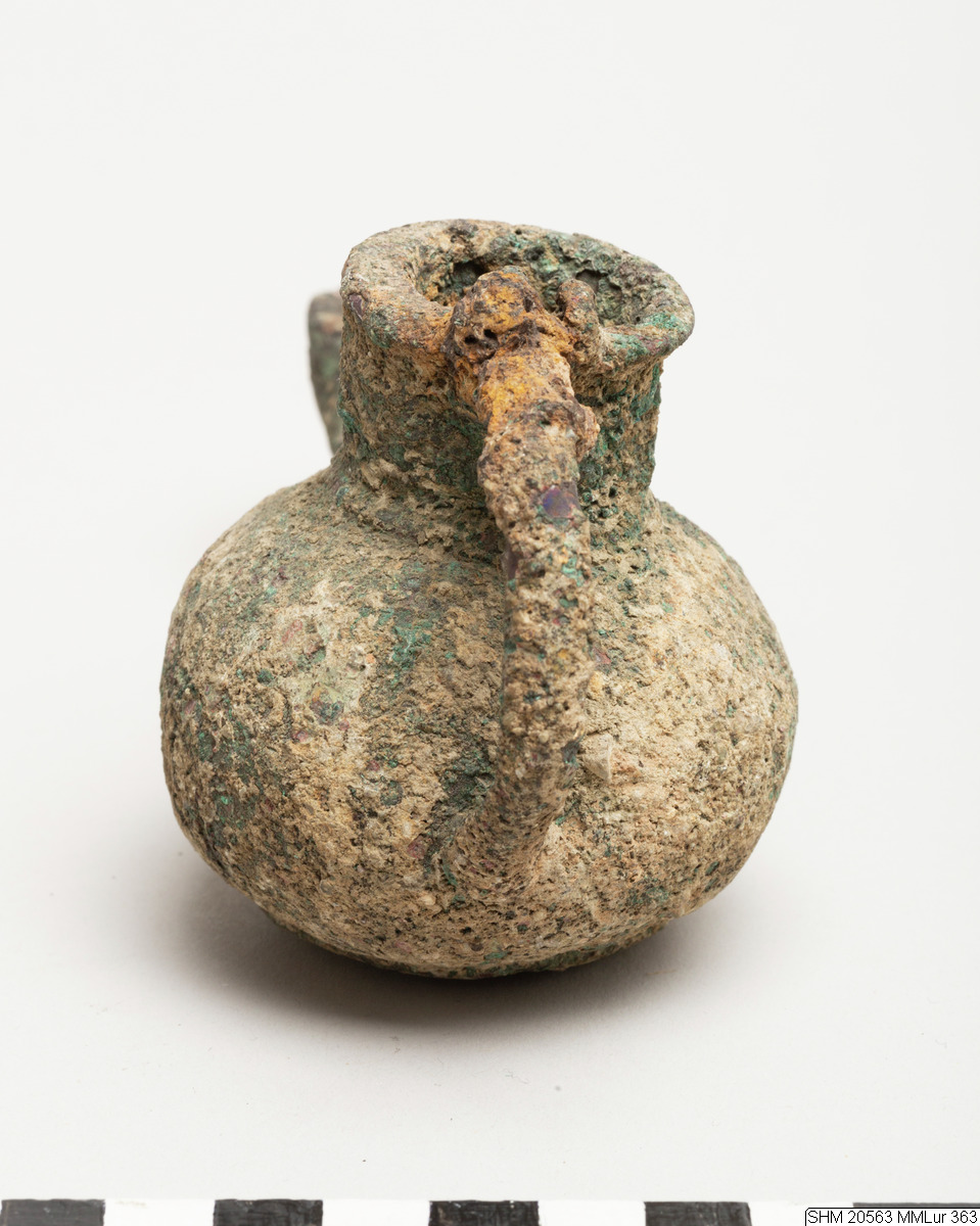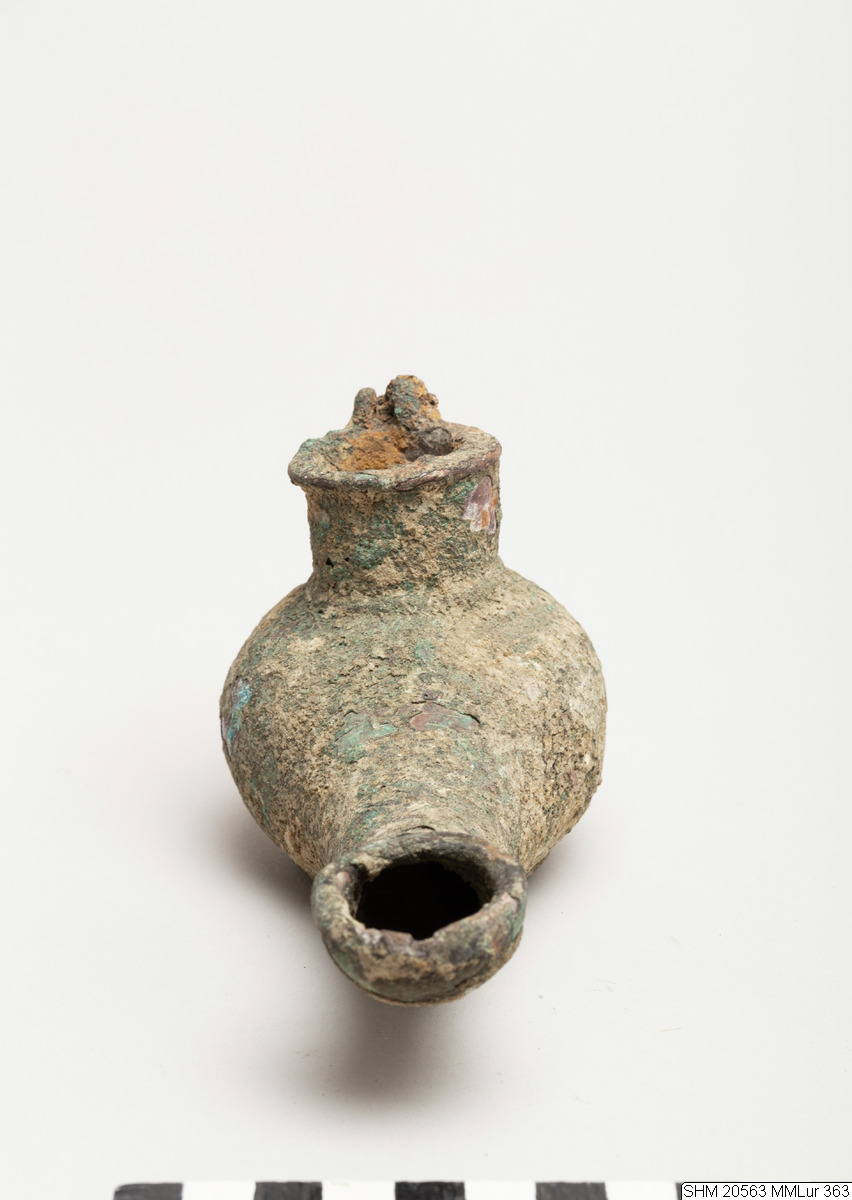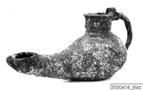 - Cast. Flat bottomed globular body with long cylindrical spout extends out from one side, vertical narrow neck, everted rim, wire handle loop from neck to body. Teardrop shaped foot plate.
