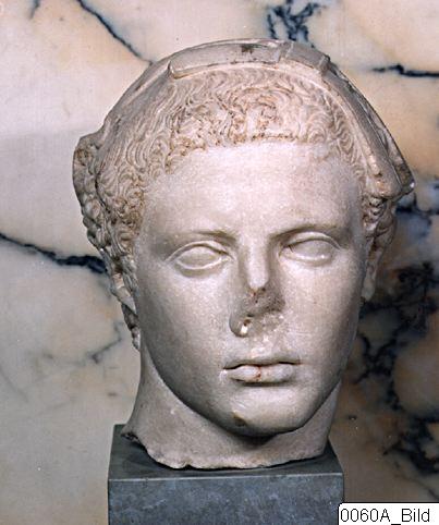 Marmorhuvud av atlet. Romersk kopia av grekisk bronsskulptur som föreställer en boxare med skyddshuva av läderremmar. Tillskriven skulptören Myron, 400-tal.