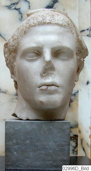 Marmorhuvud av atlet. Romersk kopia av grekisk bronsskulptur som föreställer en boxare med skyddshuva av läderremmar. Tillskriven skulptören Myron, 400-tal.
