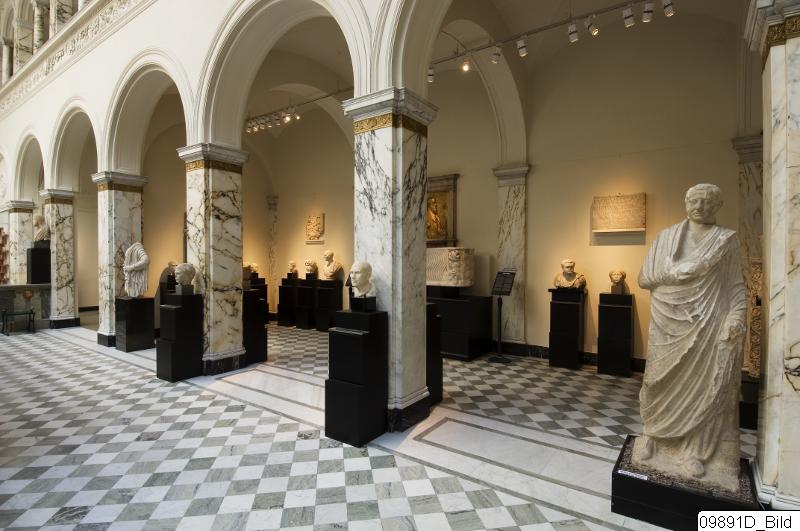You will find parts of the Greek and Roman collections along one side of the central hall. One section highlights the ancient mythology. Below are pottery and sculpture with motifs taken from the Greek myths, such as the deities Athena, Apollo and Artemis, and the heroes Achilles, Heracles, Orpheus and exciting adventures. Also the symposium, the Greek men's drinking, is depicted in a booth . Here you will find all the different parts of tableware and many images of Dionysos , the god of wine.