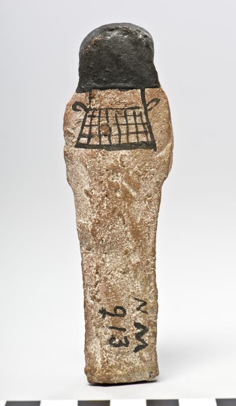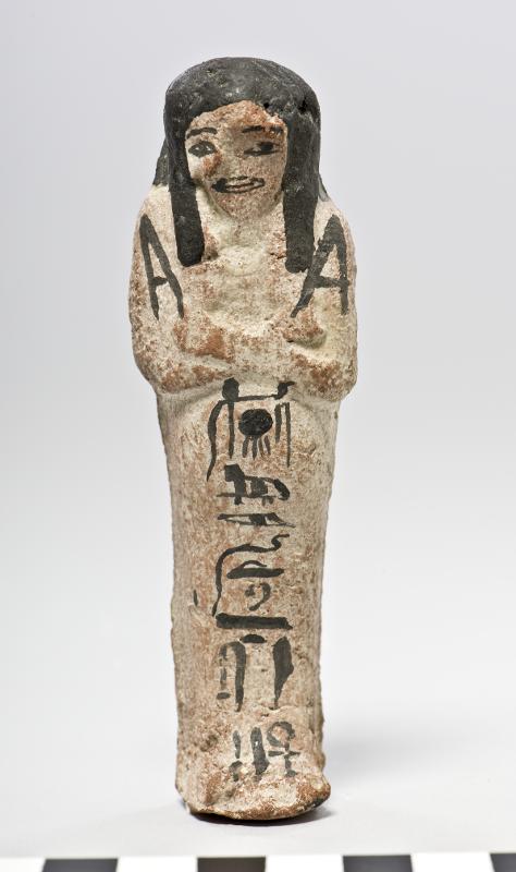 - Ushebti in terracotta. Painted in beige with inscriptions in black. Made for dd-m3t-iw.s-nh.