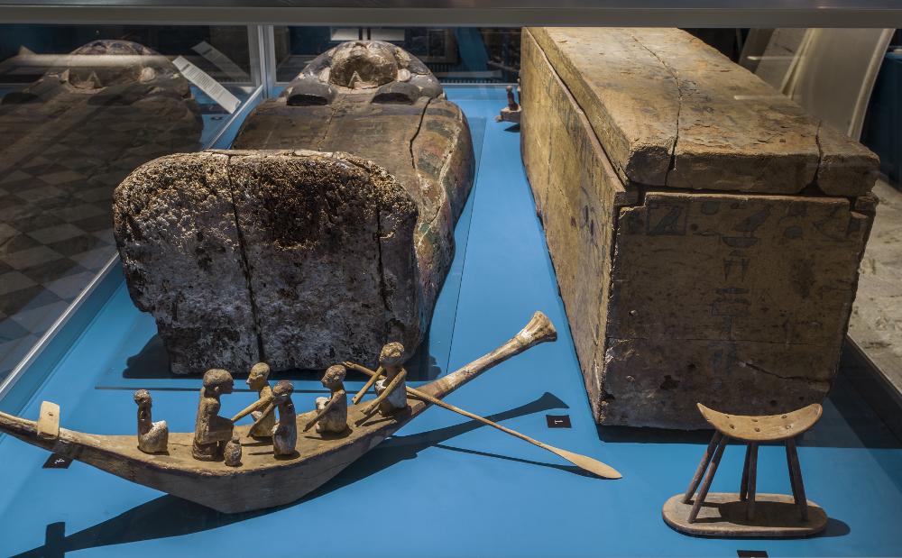 The Egyptian Exhibition contains, in addition to mummified humans, also mummies of cats, birds, fishes and snakes. The Goddess Isis with the child Horus in her lap meets the visitors as they enter the exhibition. The pose she holds occurs commonly in western art where the Virgin Mary with the child Jesus often is portrayed in the same position.