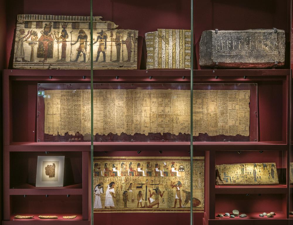 One of the most popular chapters of the Book of the Dead is Chapter 125, where the heart of the dead is weighed before the Court of Osiris. The picture in the middle of this showcase is a copy of a papyrus that once belonged to a man called Ani.