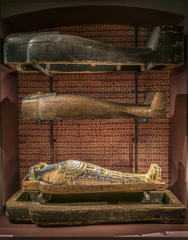 As of the New Kingdom, human-shaped coffins, often two or three placed inside another, became commonplace. The outermost coffin had to be of significant size in order to house its two interior coffins. The mummy was placed on its back in the innermost coffin. The coffins were painted and decorated with religious motifs as well as the name and titles of the deceased.