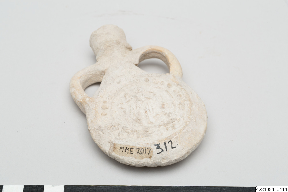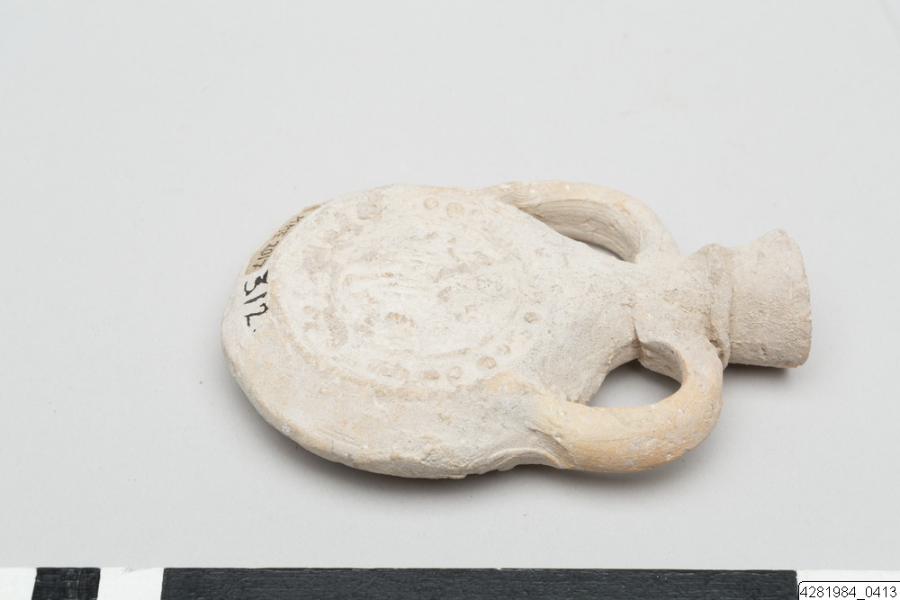- Flask of grey clay. Flattened body. Cast. Mirrored motif of standing human figure in relief on body; faint, difficult to discern. Elongated ring around rim. Twin handles from neck to shoulder.