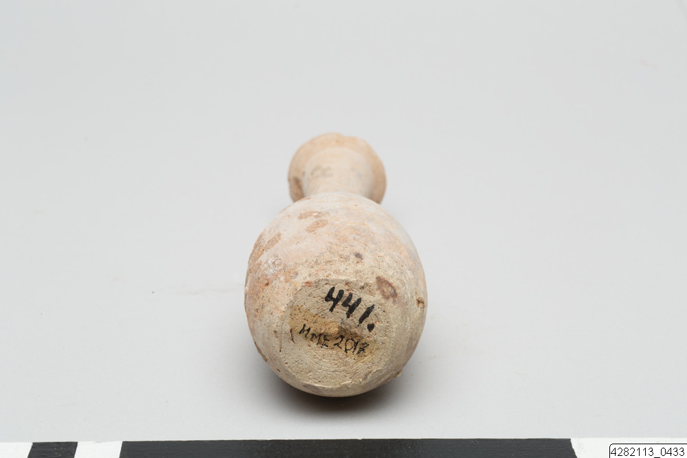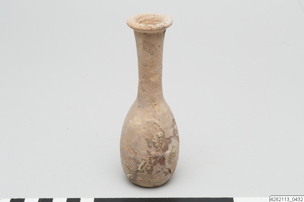 - Piriform unguentarium of red clay. Flattened base. Elongated cylindrical and slightly splaying neck ending in a splaying lip.