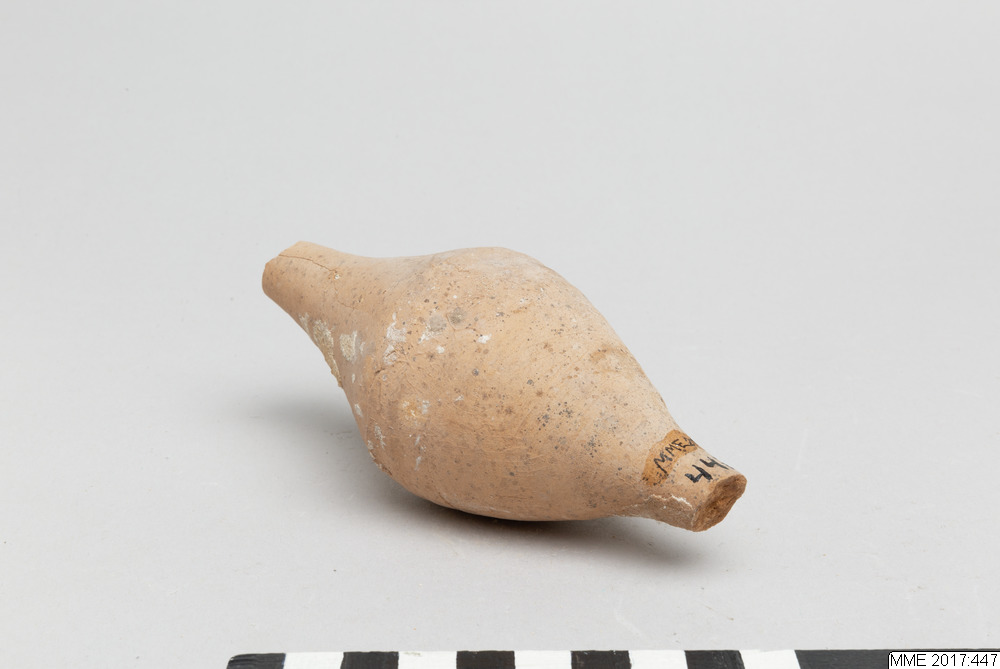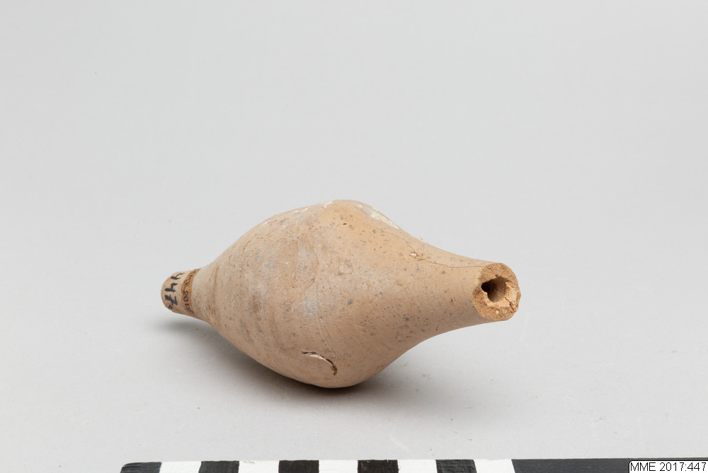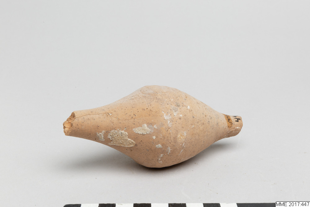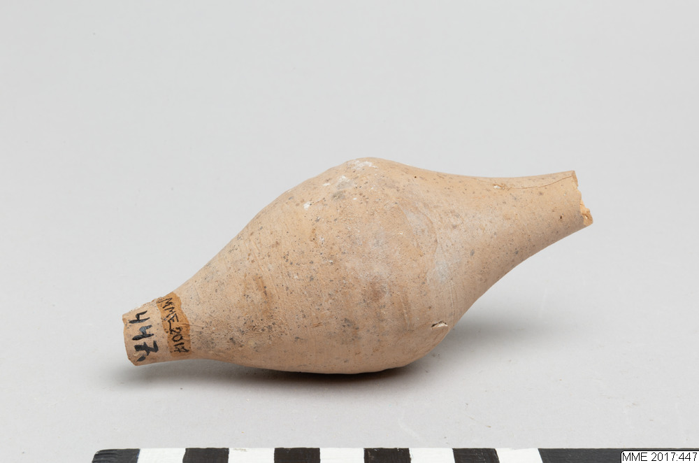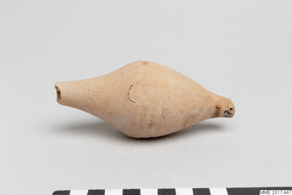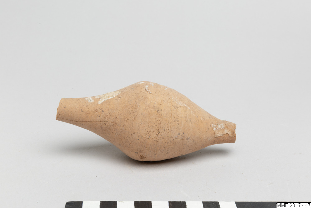 - Fusiform unguentarium of red clay. Broken at both neck and base. The former appears to have been slightly concave.