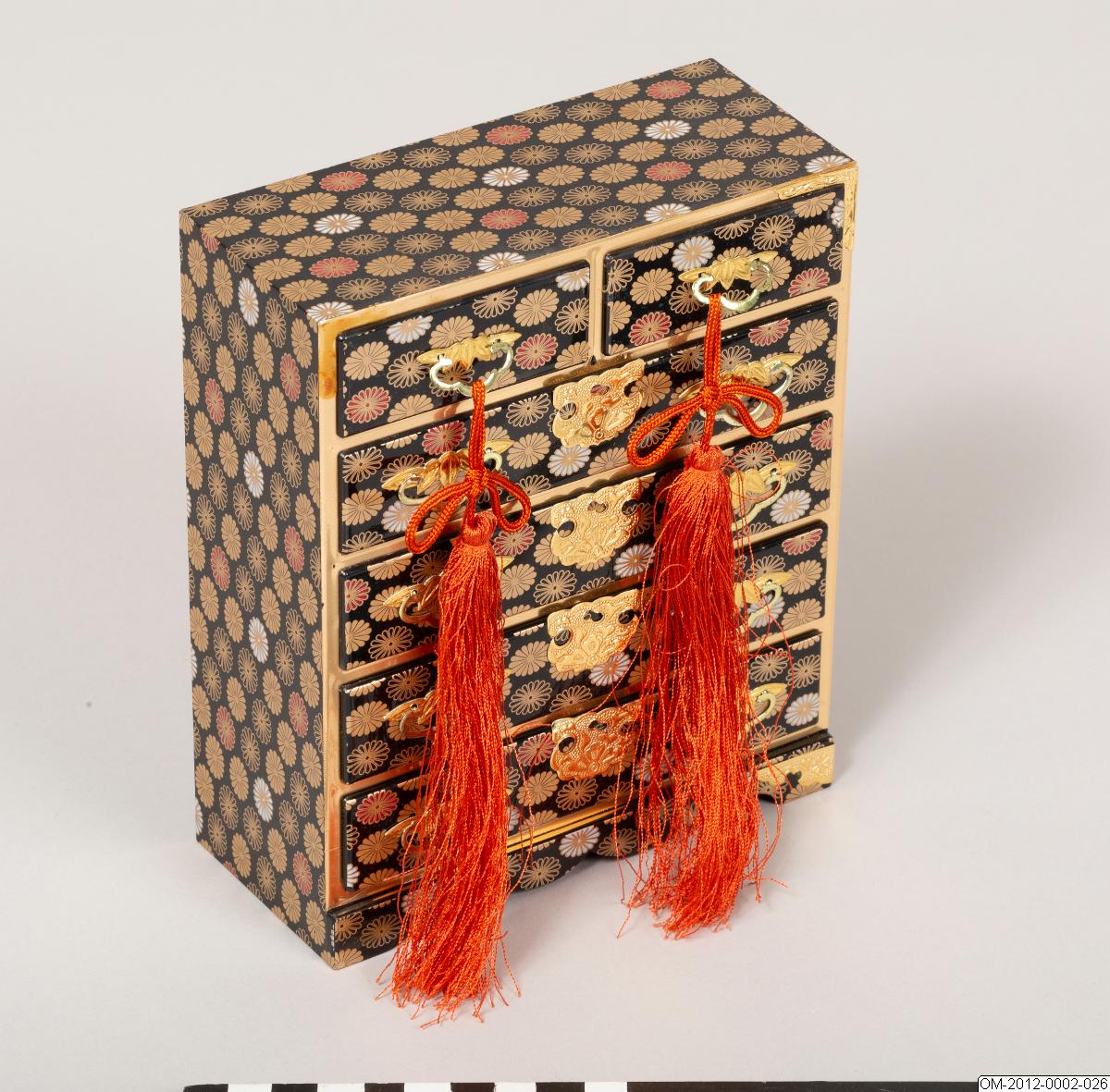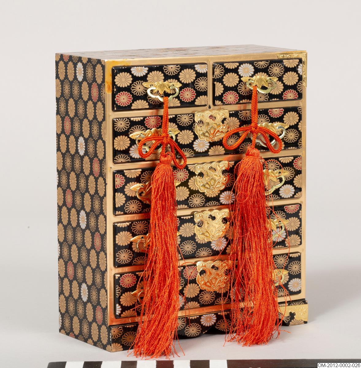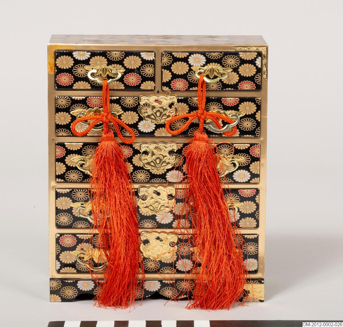 Miniatyrbyrå med sex lådor med tofsar hängande från översta lådornas handtag.