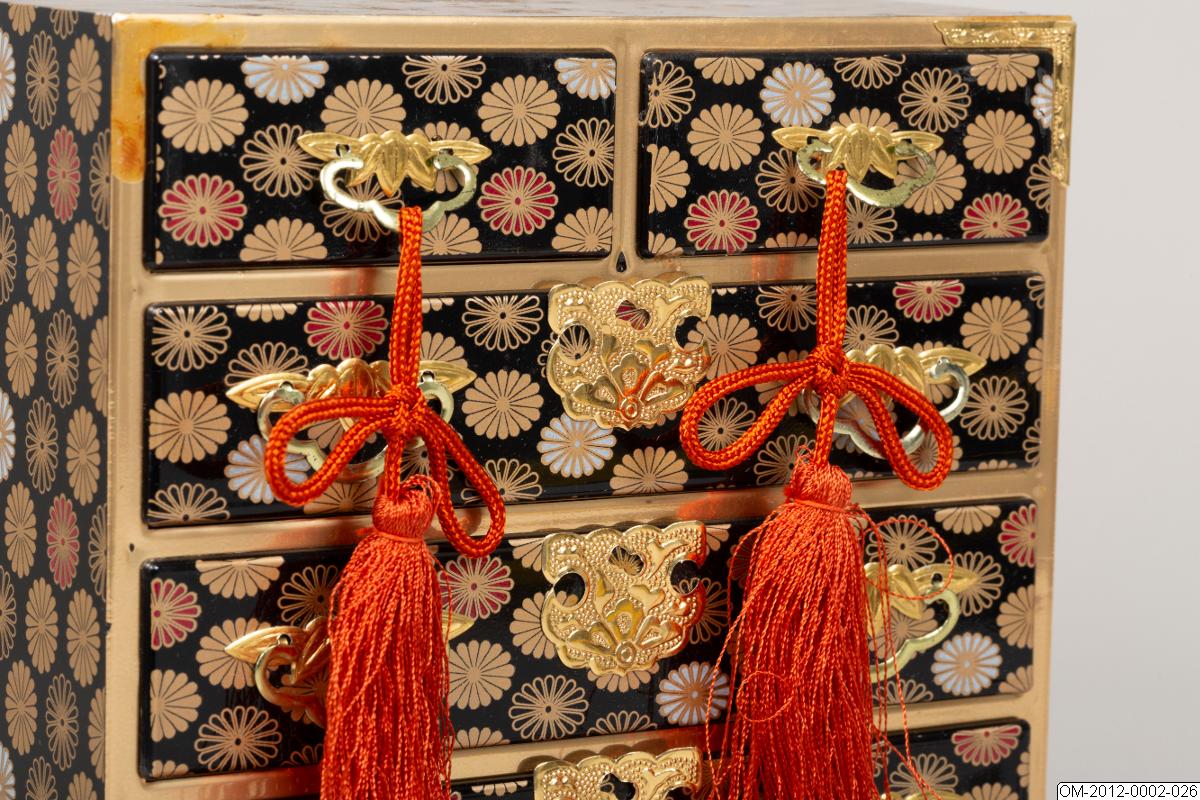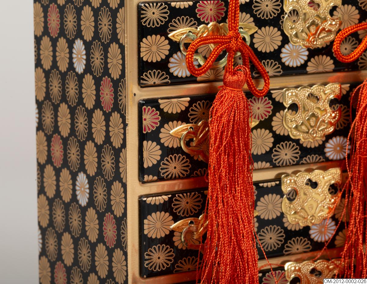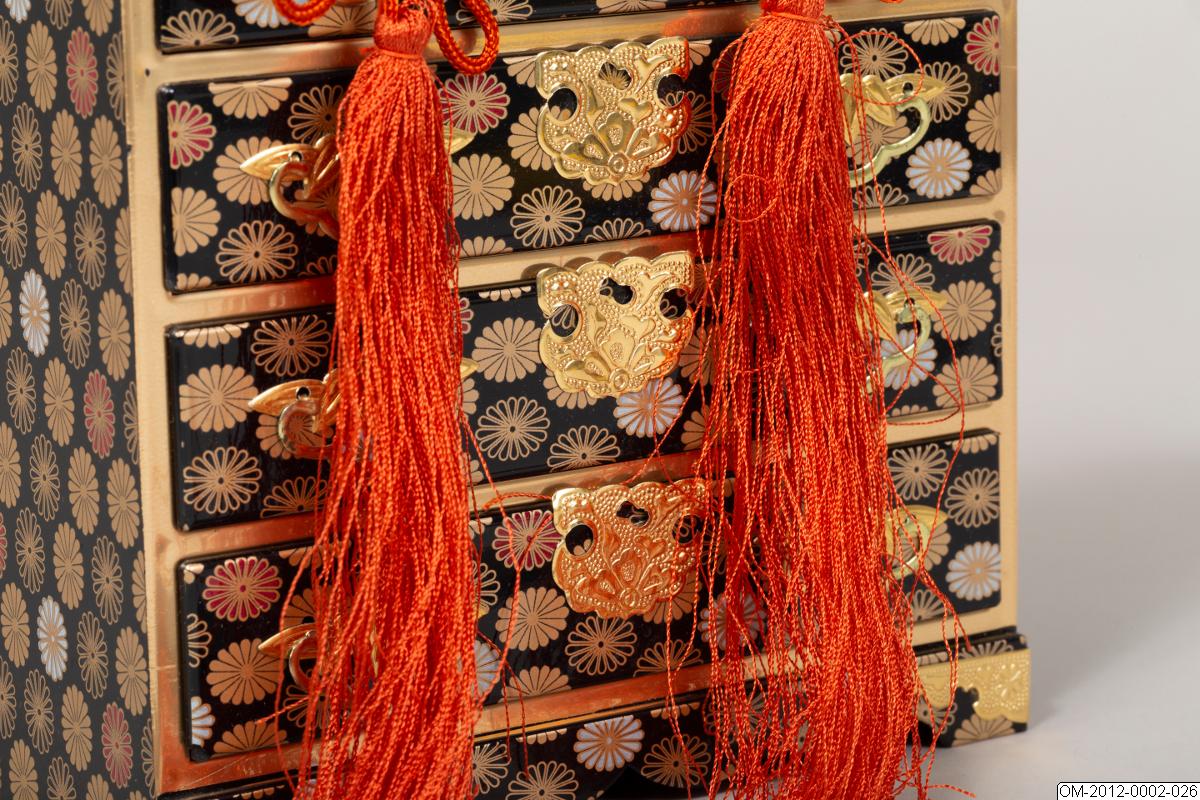 Del av uppsättning föremål till den japanska dockfestivalen, hina matsuri. Se introducerande beskrivning av dockfestivalen på samlingsnivån för OM-2012.