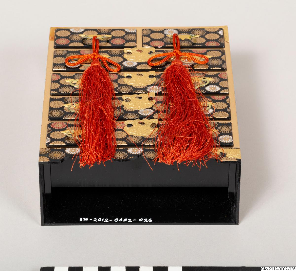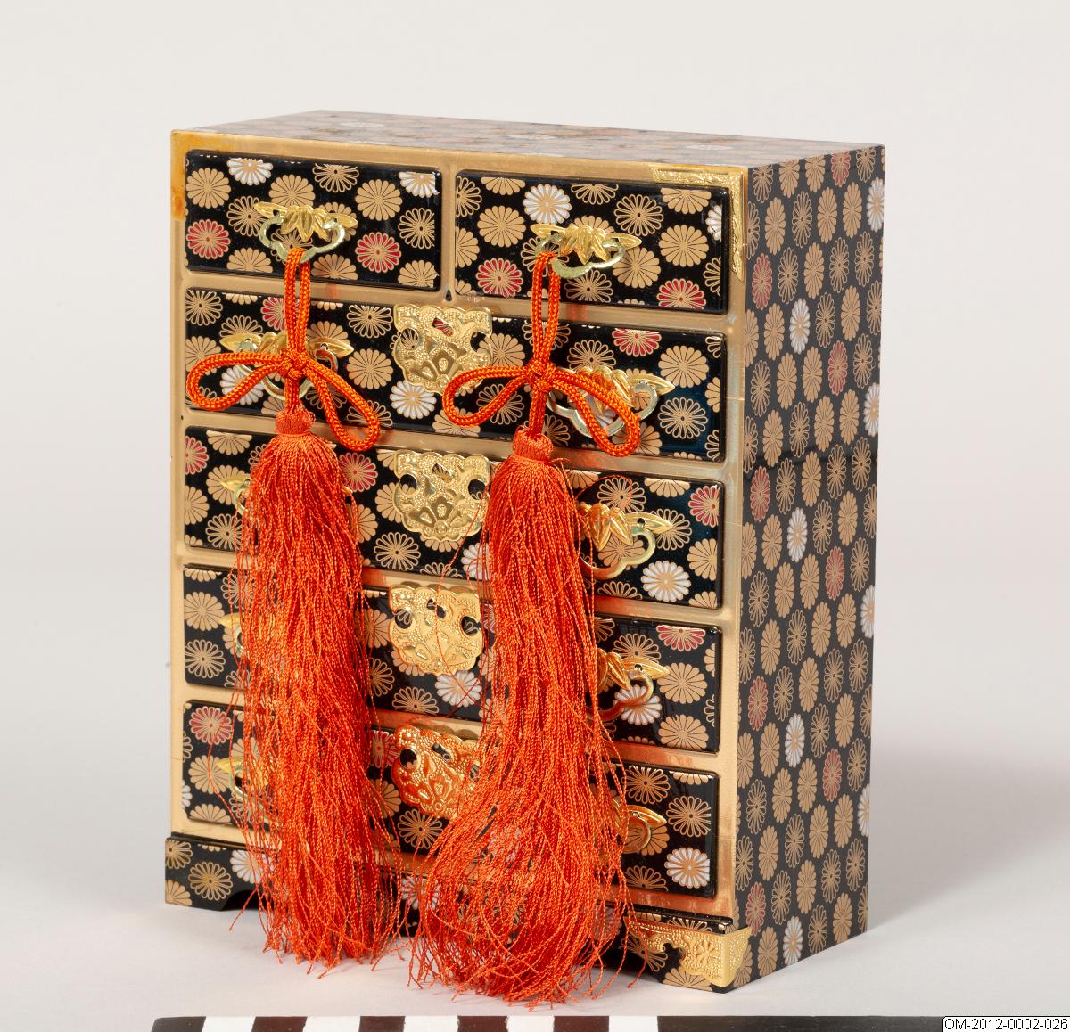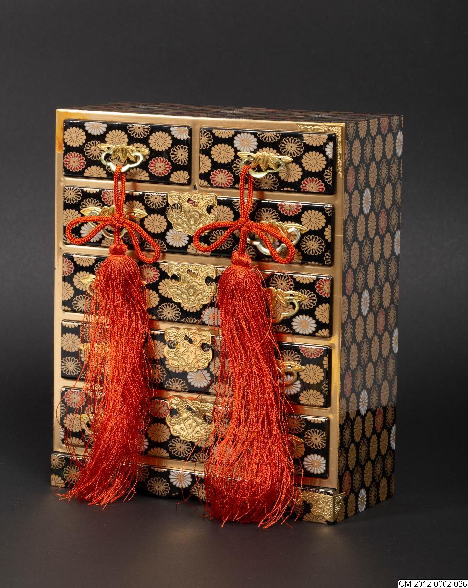 Del av uppsättning föremål till den japanska dockfestivalen, hina matsuri. Se introducerande beskrivning av dockfestivalen på samlingsnivån för OM-2012.