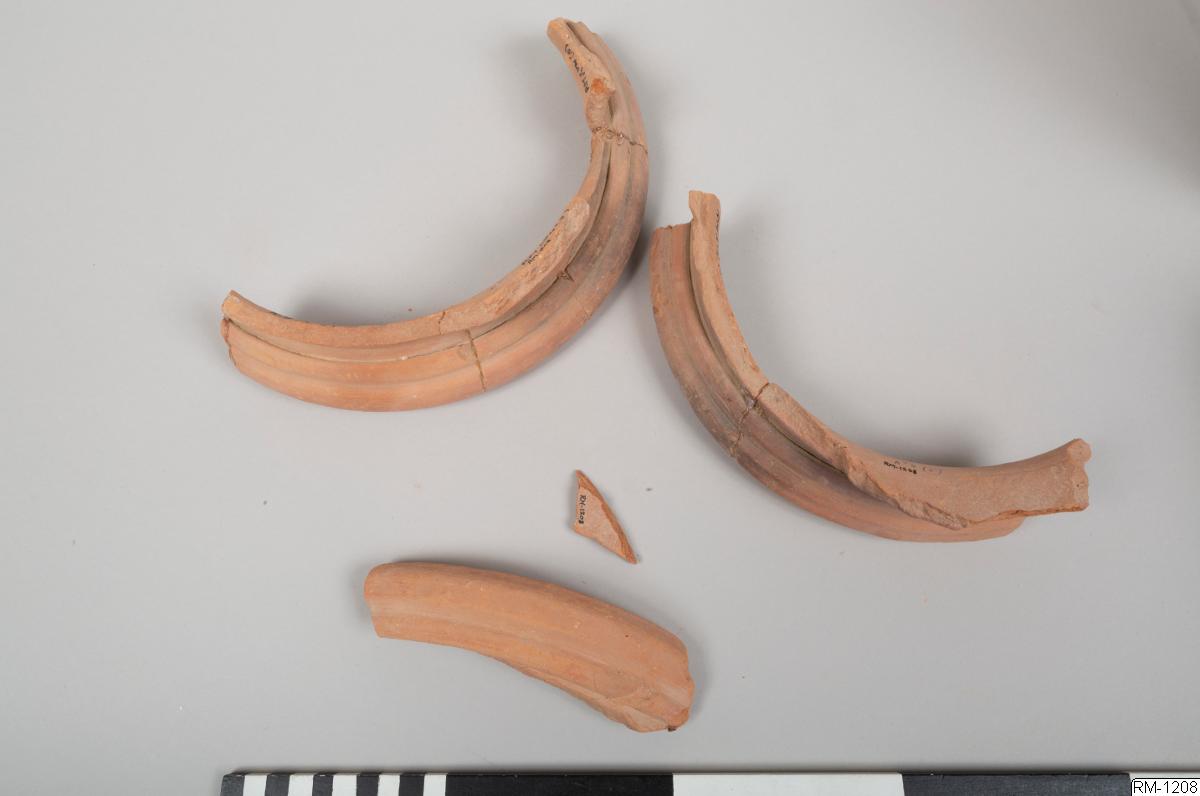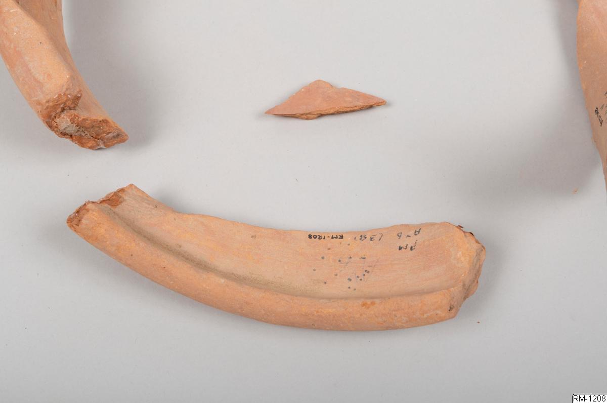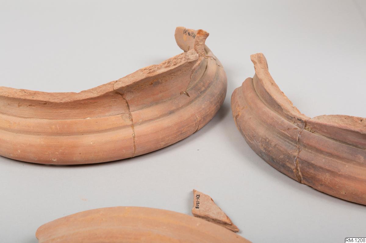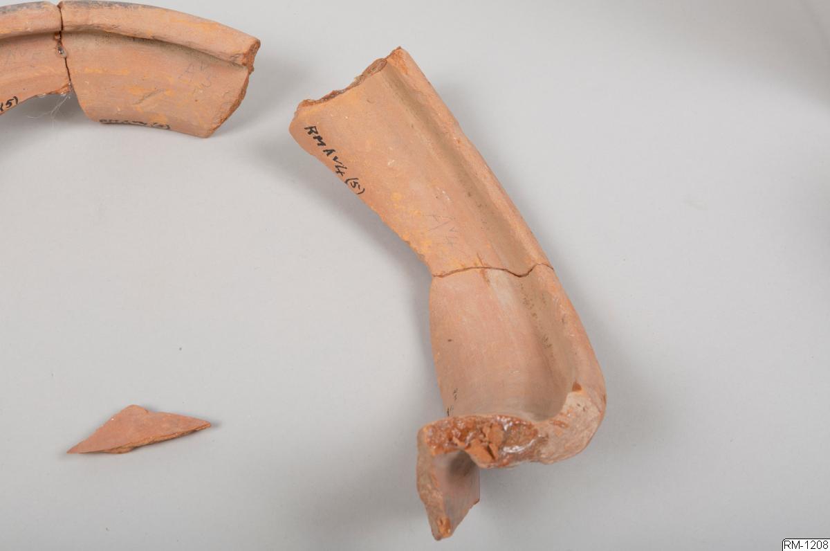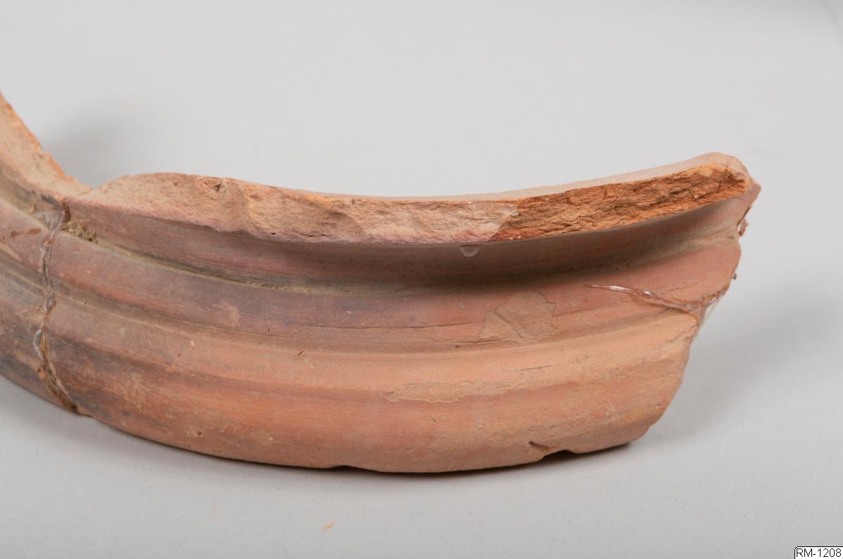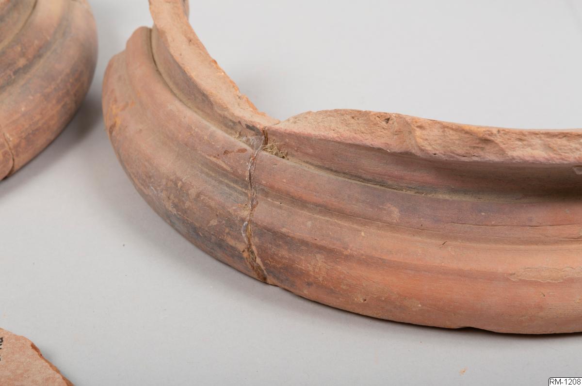 - Mynnigndel från kruka, i fyra delar. Rött lergods.