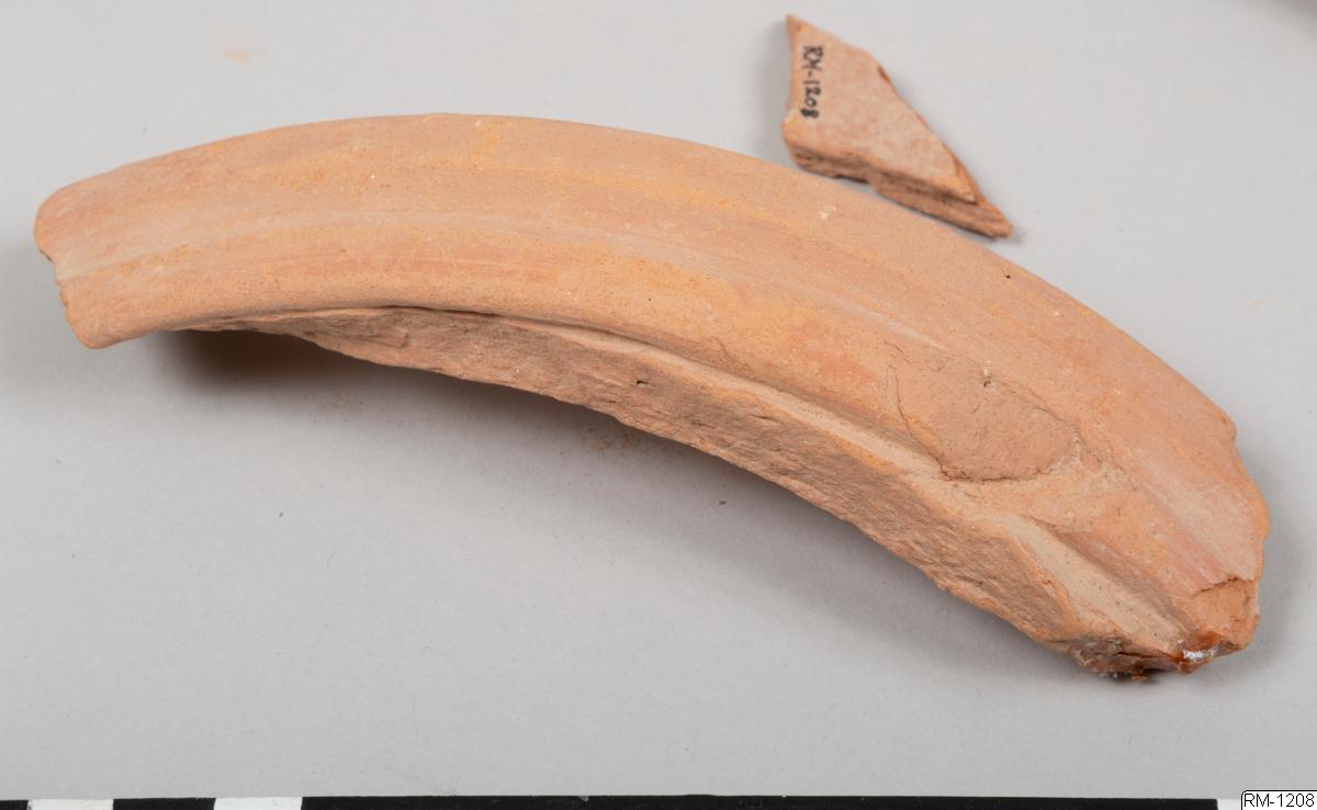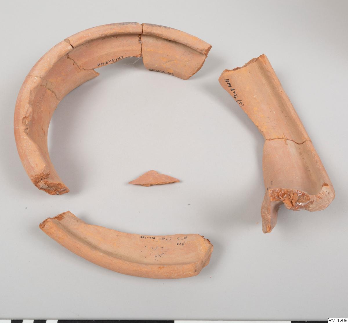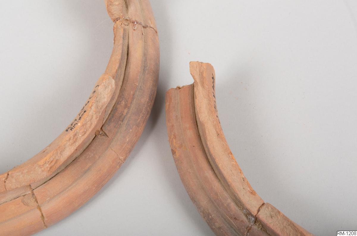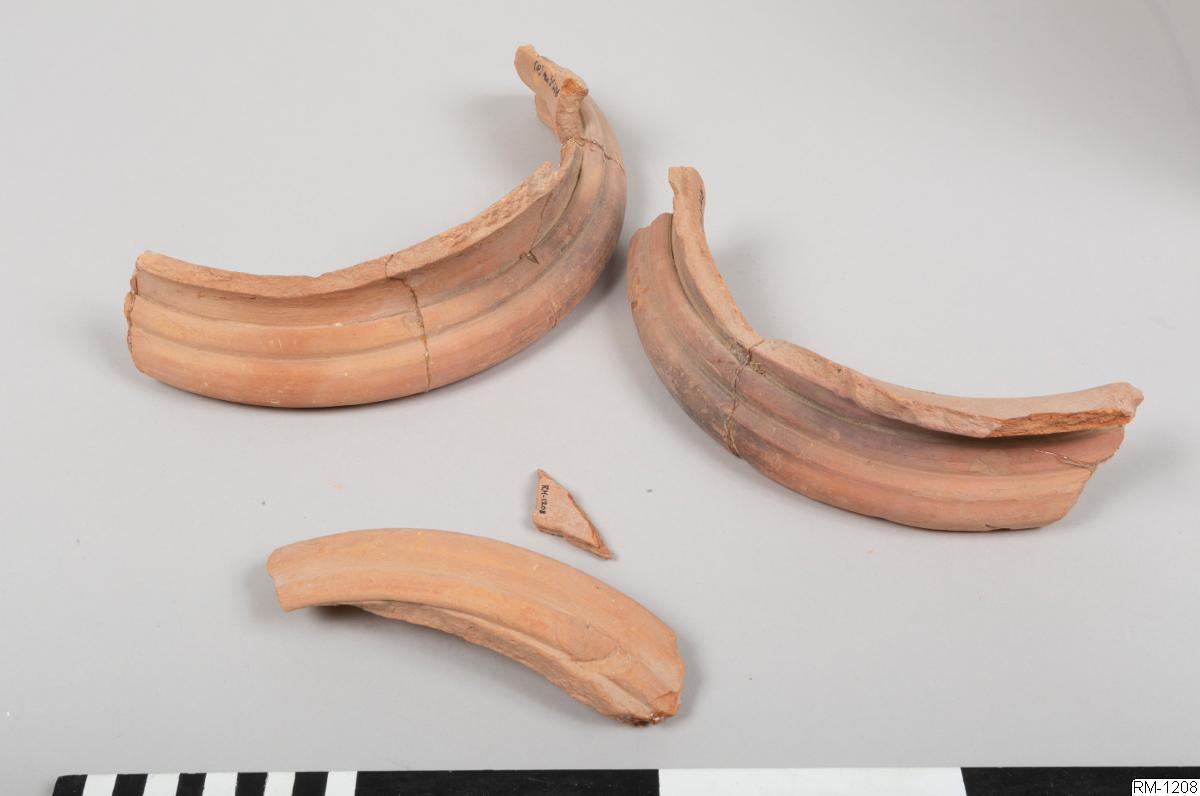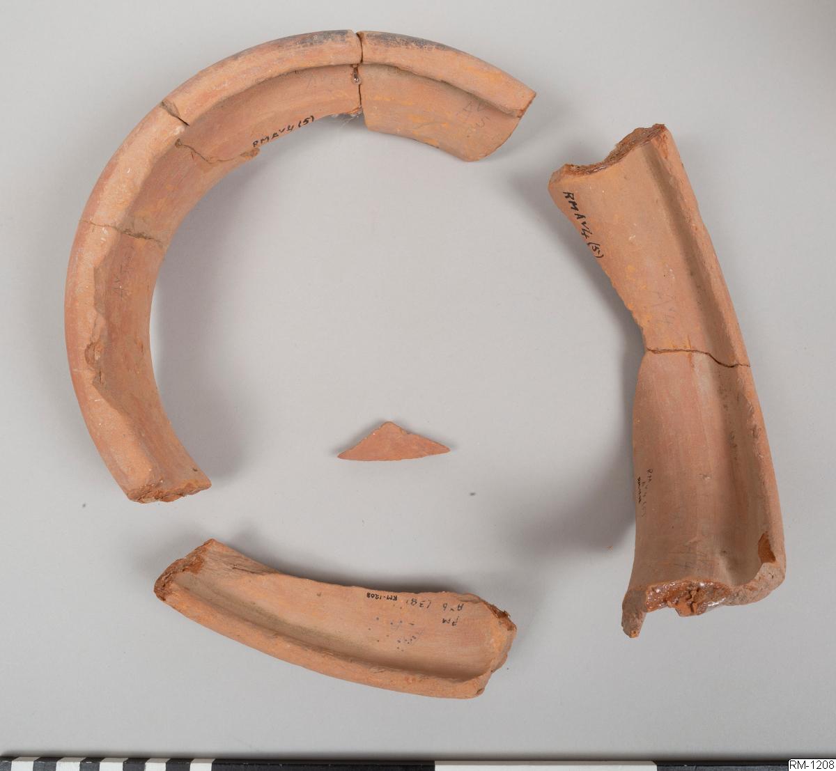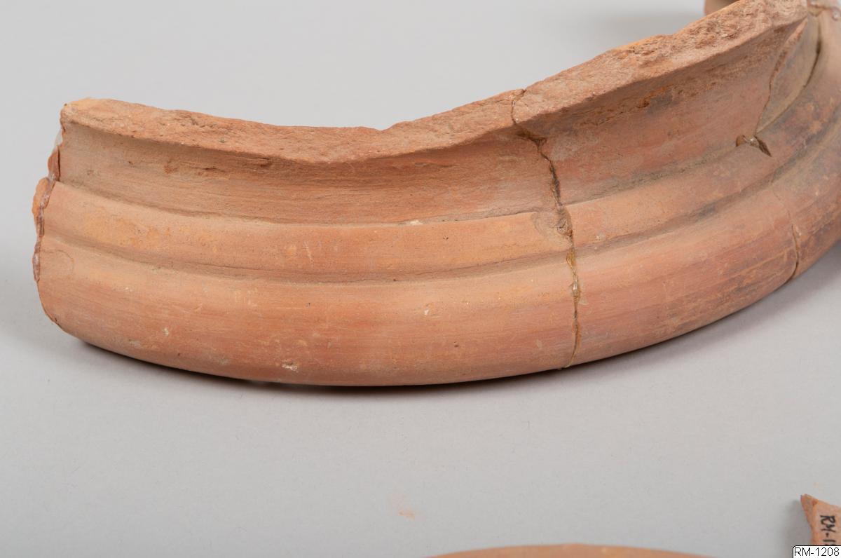 - Mynnigndel från kruka, i fyra delar. Rött lergods.