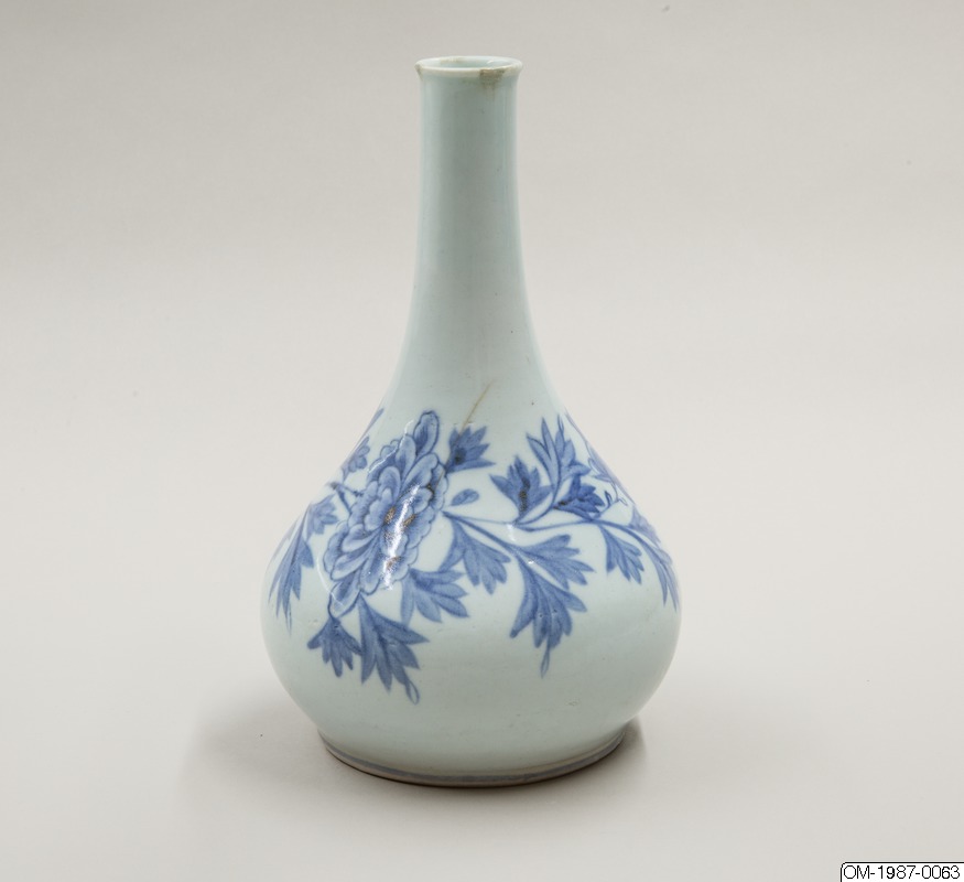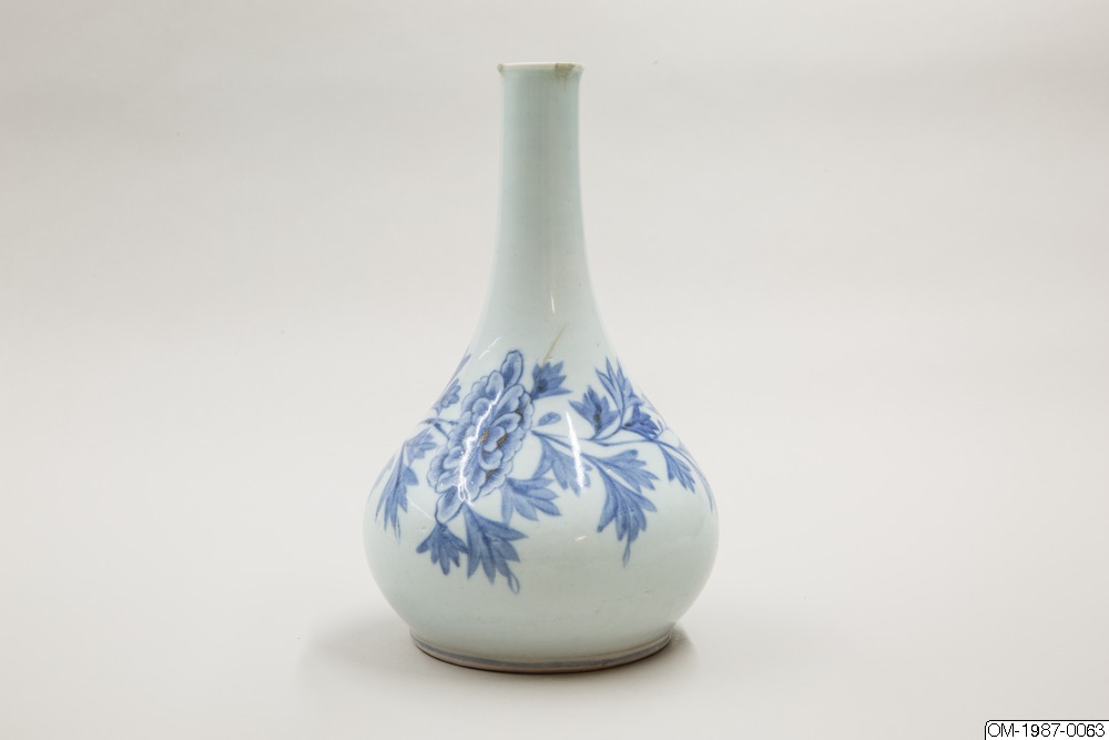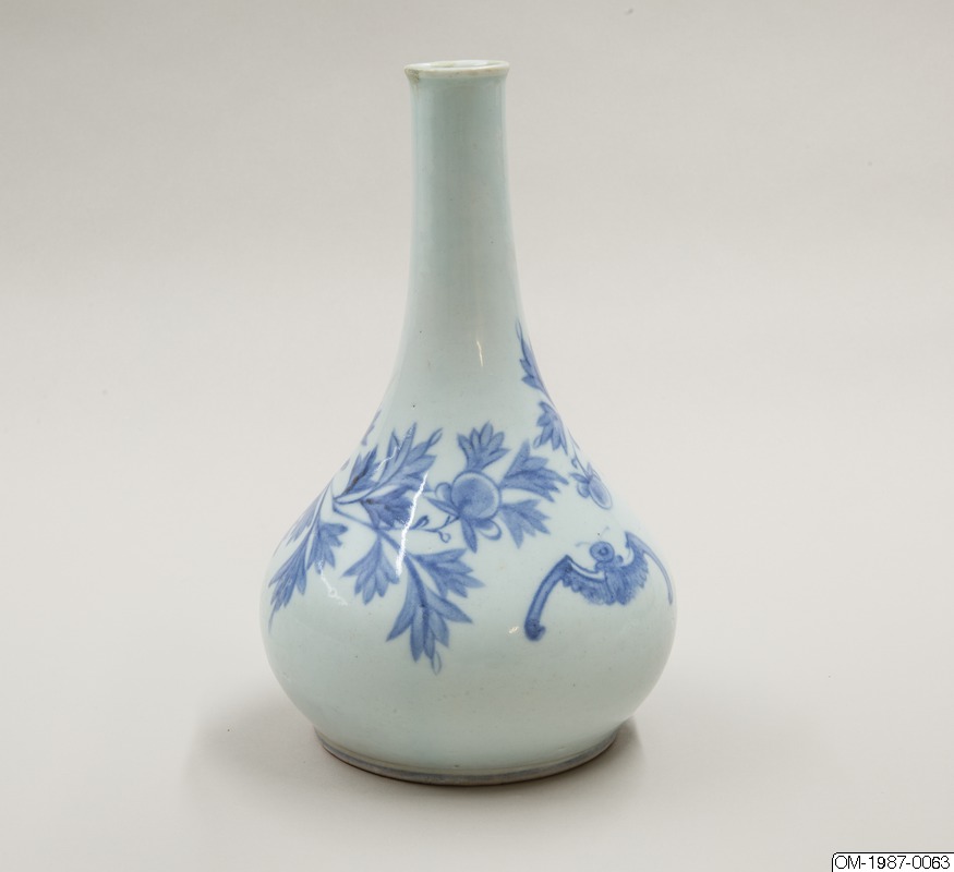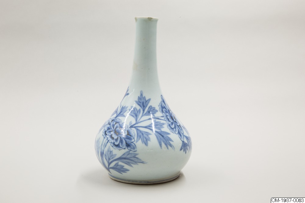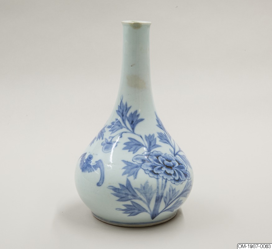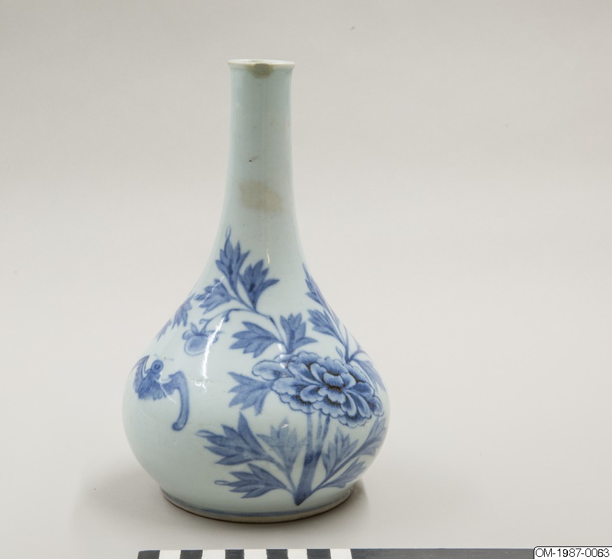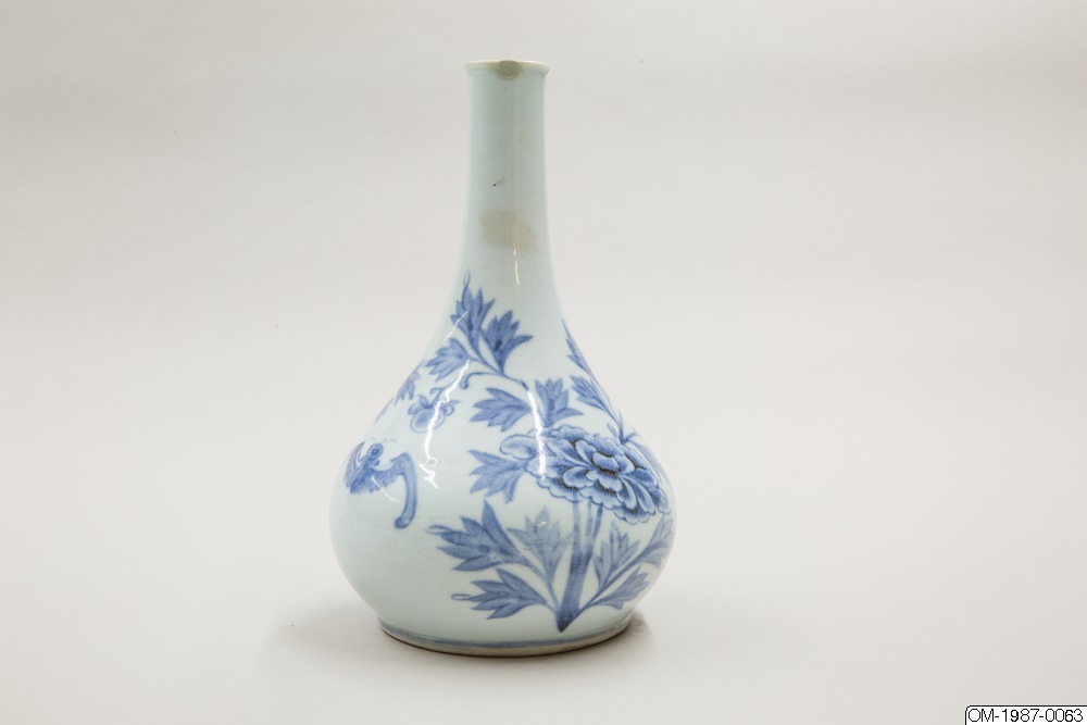Den här päronformade flaskan är dekorerad med ett omsorgsfullt utarbetat motiv i underglasyrblått som föreställer en kvist pioner och en fladdermus. Flaskan har en utsvängd mynning och en lång hals som övergår i en sluttande kropp. Pionen omsluter flaskkroppens bulliga buk och är målad i gureuk-stil - lövens och blombladens konturer är målade med mörkblåa tunna linjer och ifyllda med en lavering i en ljusare blå nyans. Kanterna på pionens blomblad har lämnats vita och blått pigment har används i olika nyanser för att skapa kontrast och ett mer realistiskt uttryck. Den stiliserade fladdermusen är målad på samma sätt och med viss detaljrikedom. Fotringen har torkats ren från glasyr och bär inga spår av bränningssand.