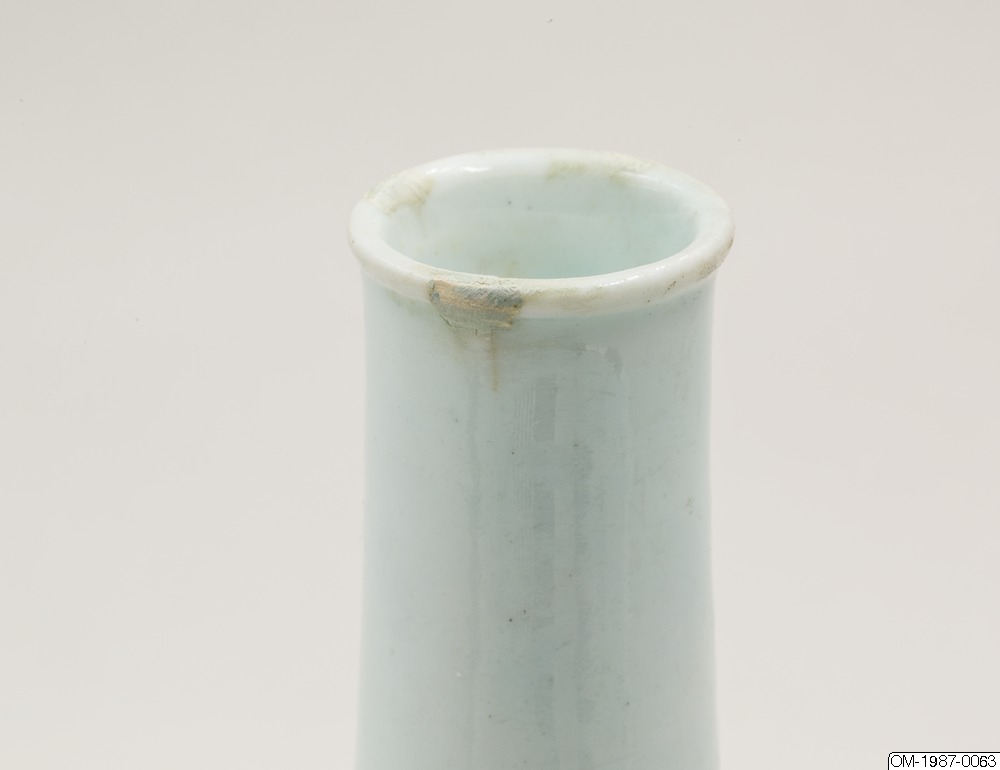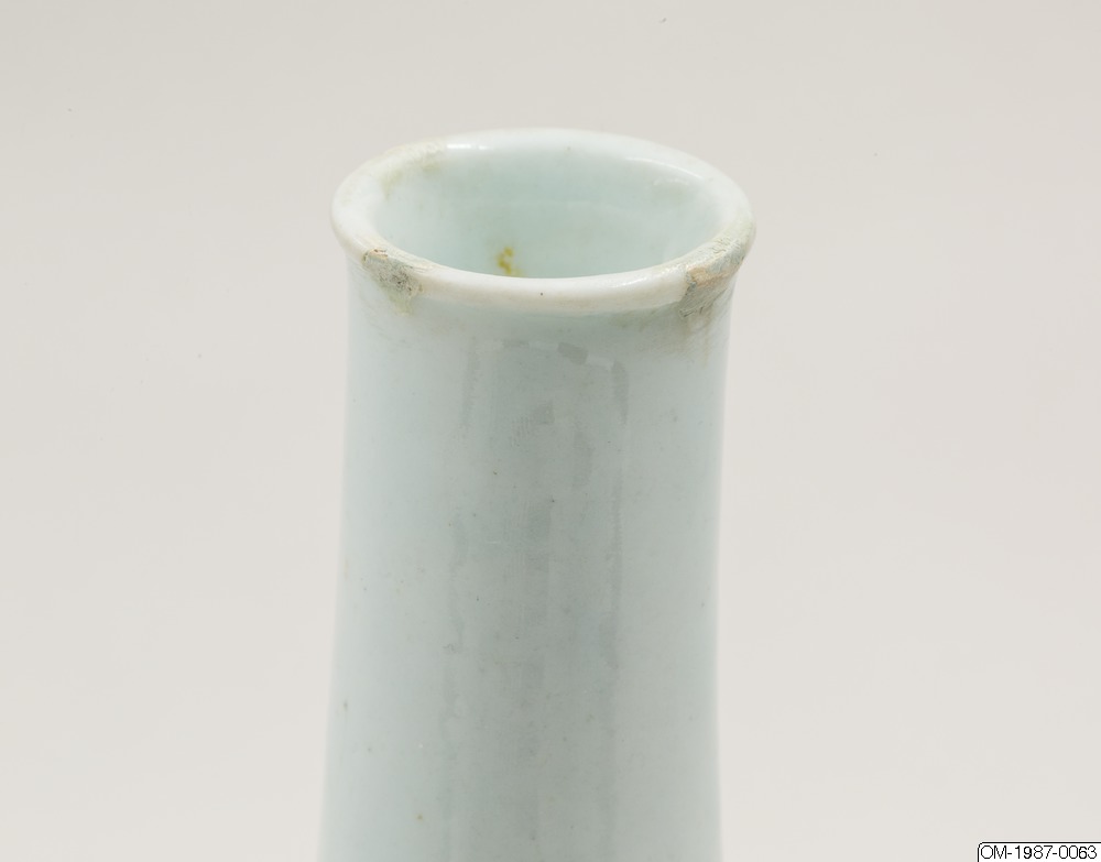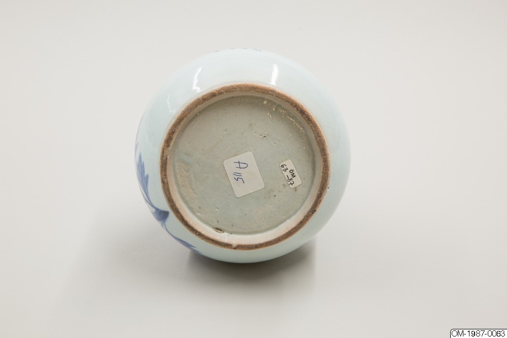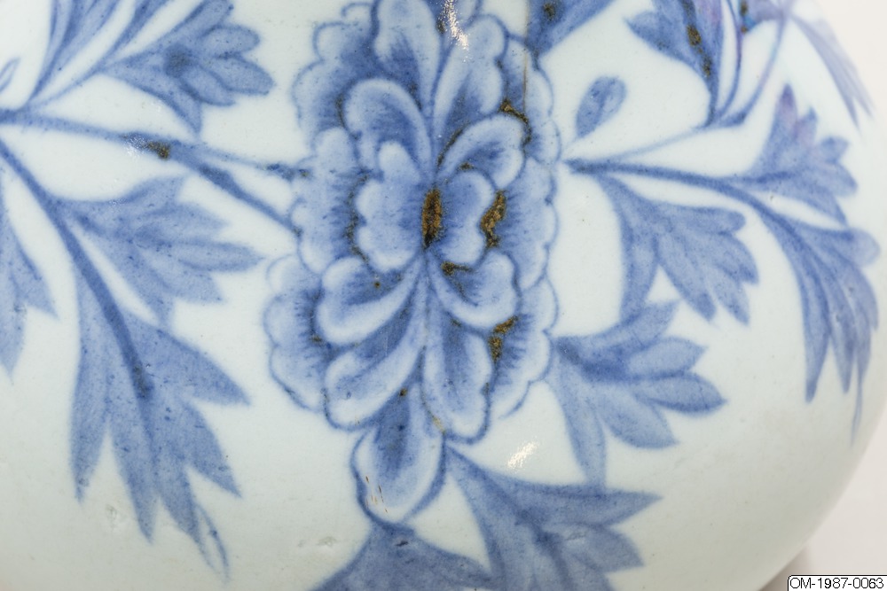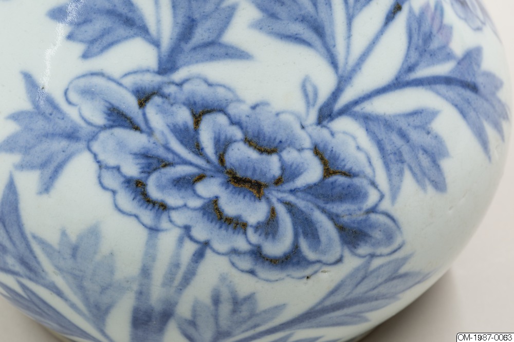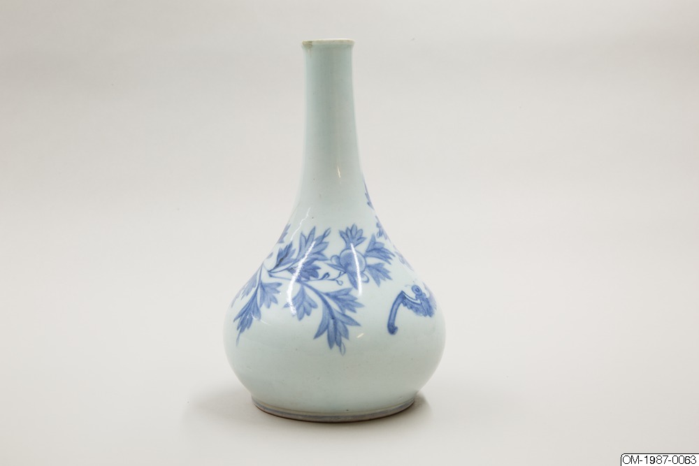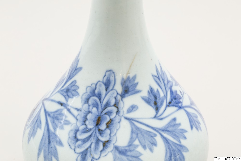 Den här päronformade flaskan är dekorerad med ett omsorgsfullt utarbetat motiv i underglasyrblått som föreställer en kvist pioner och en fladdermus. Flaskan har en utsvängd mynning och en lång hals som övergår i en sluttande kropp. Pionen omsluter flaskkroppens bulliga buk och är målad i gureuk-stil - lövens och blombladens konturer är målade med mörkblåa tunna linjer och ifyllda med en lavering i en ljusare blå nyans. Kanterna på pionens blomblad har lämnats vita och blått pigment har används i olika nyanser för att skapa kontrast och ett mer realistiskt uttryck. Den stiliserade fladdermusen är målad på samma sätt och med viss detaljrikedom. Fotringen har torkats ren från glasyr och bär inga spår av bränningssand.