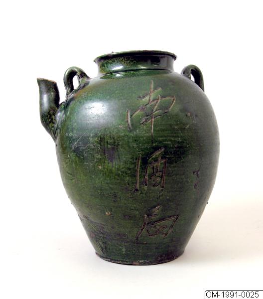 Vinkanna med liten pip och två hänklar högt placerade nära mynningens utvikta kant. Stengods med ojämnt pålagd mörkgrön glasyr. Ytan med synliga märken i leran efter tillverkningsprocessen (bucklor, streck). Inskriptioner samt inristad dekor av rudimentär trädgårdsklippa.
