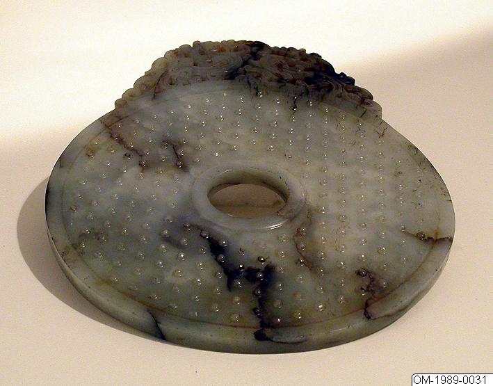 - Bi-ring av jade, dekorerad med mönster av sädeskorn i relief samt krönt av två motstående chi-drakar i genombrutet arbete.