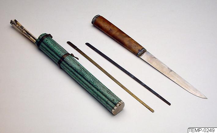 Etuiet är klätt med grönt (haj?)skinn. I etuiet finns en kniv med träskaft, ett par ätpinnar av ben, två metallstickor, en pincett av ben och metall, två benstickor, samt en liten kniv av ben och metall.