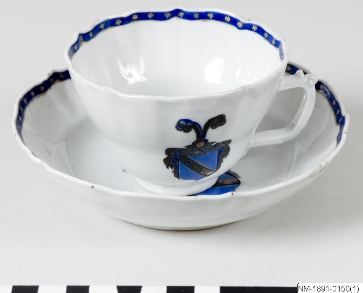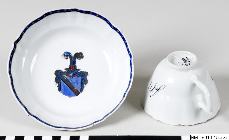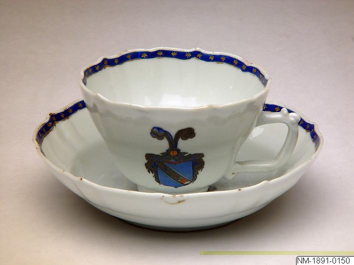 - Fat, porslin, Kina. Blå vapensköld på vitt. Tio pass.