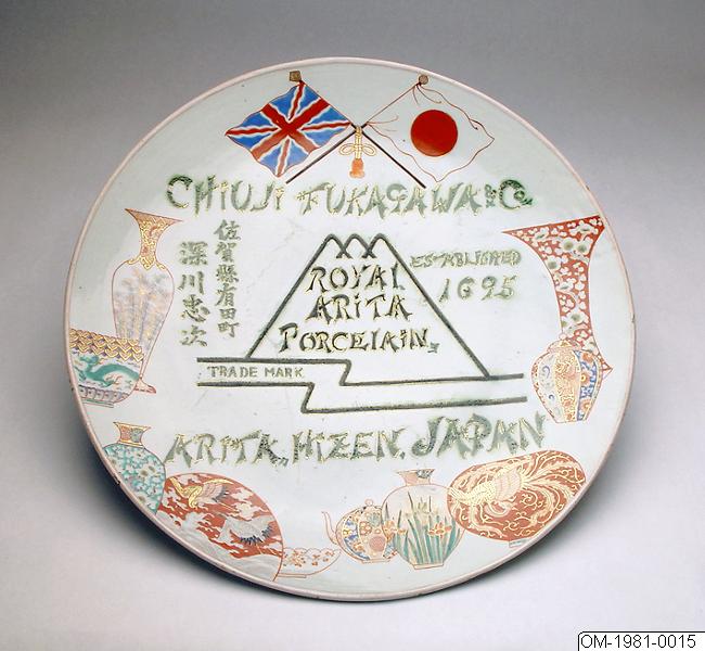 Dekorerad i emaljfärger med olika typer av vaser, fat o dyl, engelska och japanska flaggan samt inskriptioner på engelska och japanska.