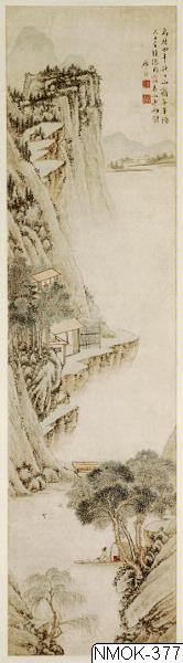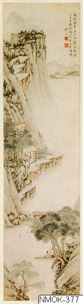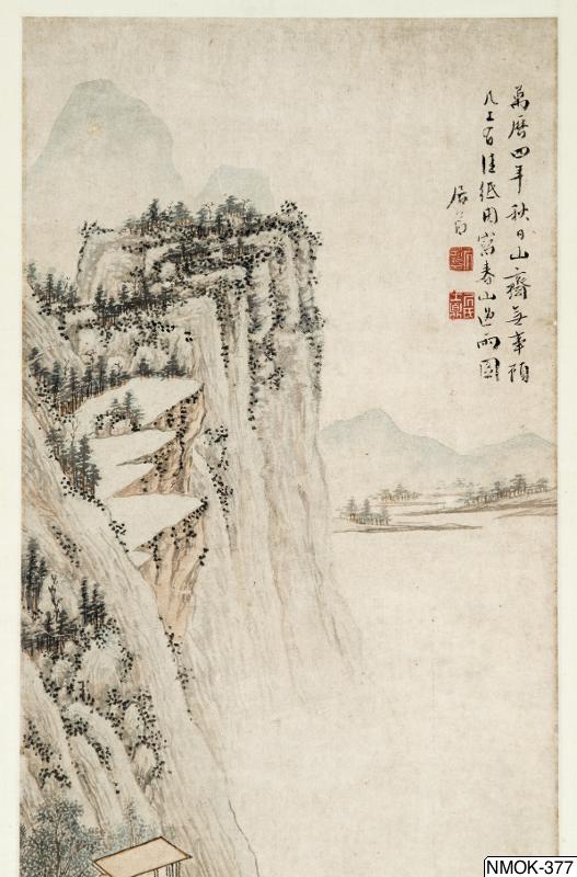 - Inskrift: Wanli (periodens) fjärde år (1575), en höstdag, då jag var fri från arbete i min bergshydda, Där fann jag gott papper på border och målade denna bild av vårens berg efter regn, Ju Jie,