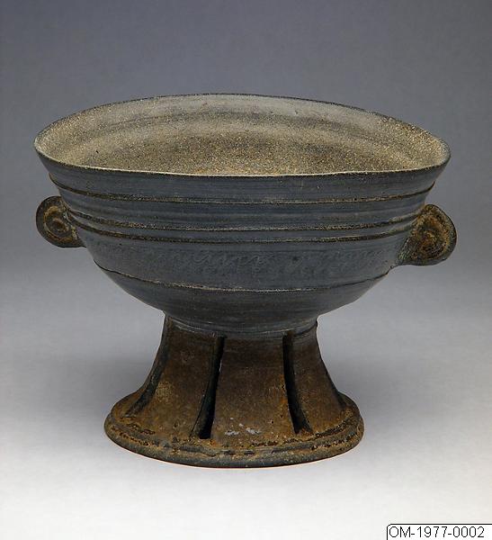 Skål på hög fot, av hårdbränt lergods, med influens från Korea (jämför t ex OM-1987-0126).