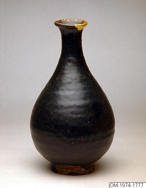 Den här flaskan i svartbrunt stengods är från Goryeo (918-1392) och har en svagt utsvängd mynning och en päronformad, bottentung kropp på ganska hög fot. Samma form finns på metallgods och celadongods från Goryeo. Den svartbruna glasyren är tjock och något tunnare runt mynningen. Fotens och fotplattans utsida har torkats rena från glasyr men basen innanför fotplattan är glaserad. På fotplattan finns märken från fem brännugnsstöd. Leran är grovkornig.