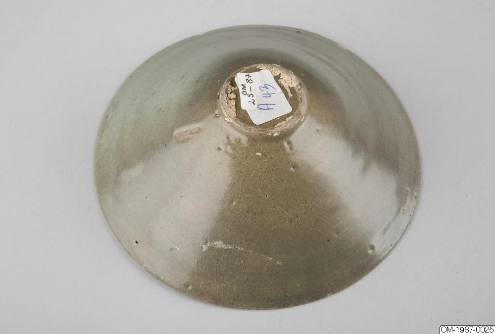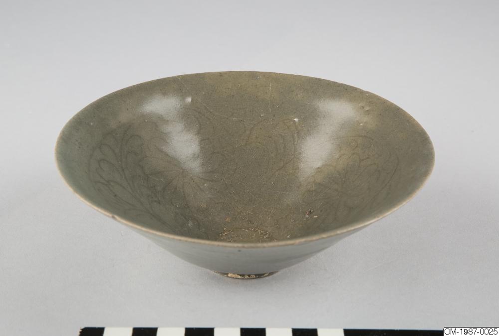 Den här skålen har en vid, utsvängd mynning och raka sidor som svänger lätt inåt ner mot basen och den smala, raka foten. På insidan är skålen dekorerad med ett inristat mönster av krysantemumblommor. Bara den runda botten och mynningskanten är utan dekor. Längsmed under mynningskanten går en inristad linje runt hela skålen. En jämn grön glasyr täcker skålen och pölar sig i de inristade linjerna, vilket skapar en kontrast mot den odekorerade ytan. På ena sidan skiftar glasyren i gult och är krackelerad. En liten yta vid foten är utan glasyr. Den smalt formade fotringen har torkats ren från glasyr och bär spår av tre bränningsstöd.