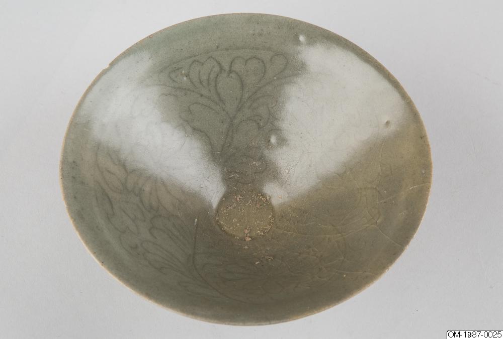 This bowl has a wide, flaring mouth and straight sides that only curve slightly toward the base and the narrow, straight foot. The interior of the bowl is adorned with an incised chrysanthemum design that spreads over the entire surface of the wall, leaving only the circular well and the rim undecorated. The decoration is closed off by a concentric ring below the rim. An even glaze with a greenish tone covers the bowl and pools in the incised lines, creating a contrast with the undecorated surface. One side of the bowl has a yellowish tone and the glaze is crackled. A small area near the foot is unglazed. The narrowly trimmed footrim has been wiped free of glaze and bears traces of three white firing spurs.