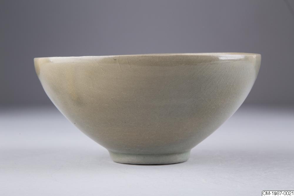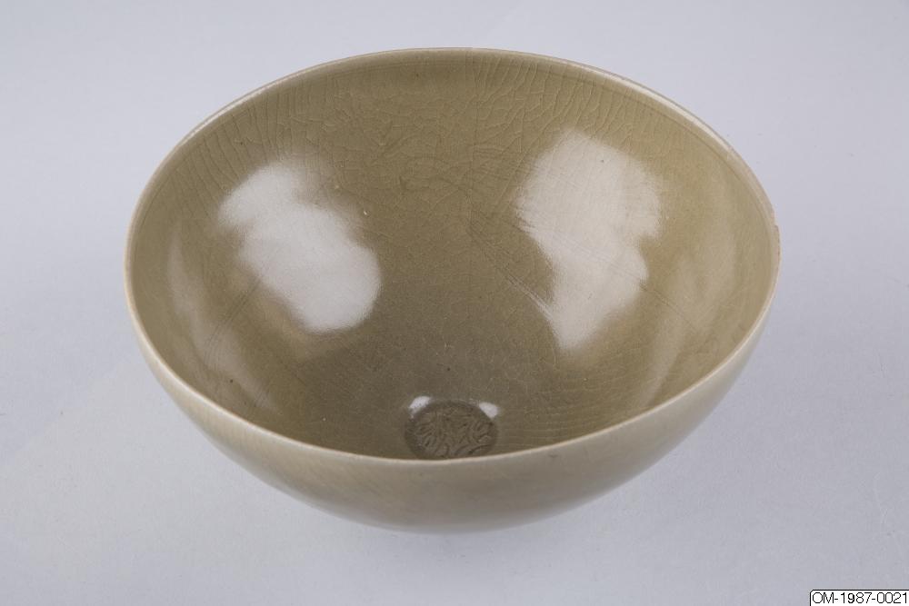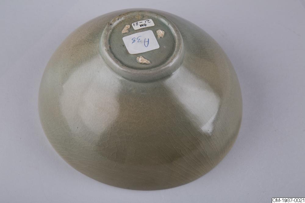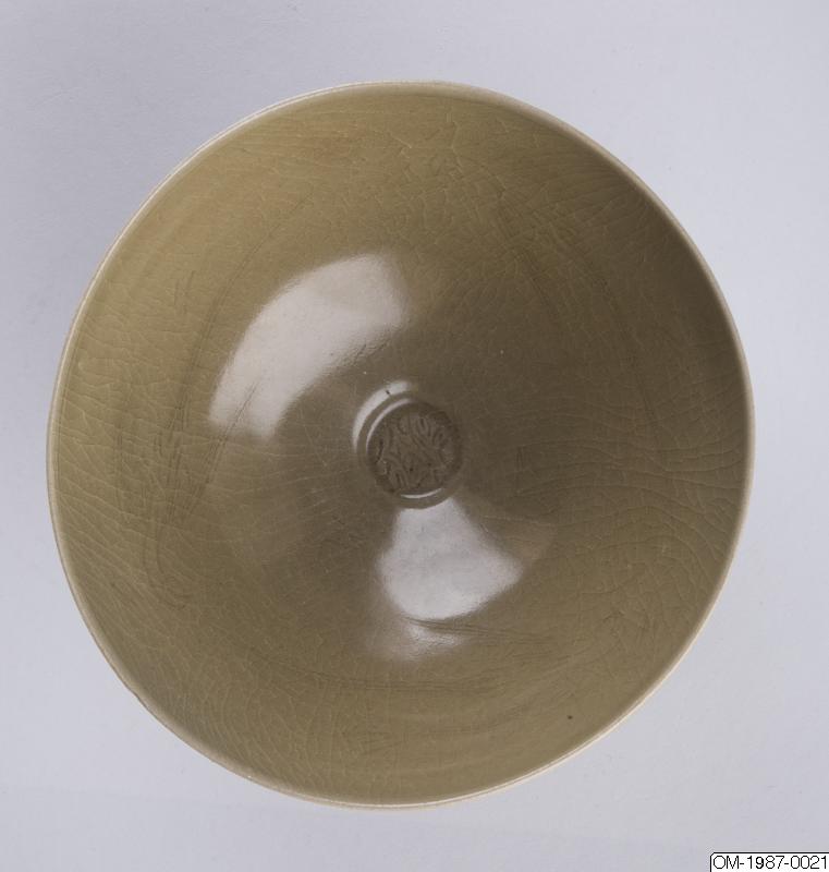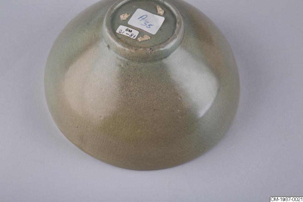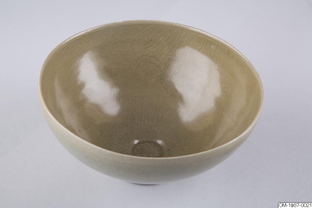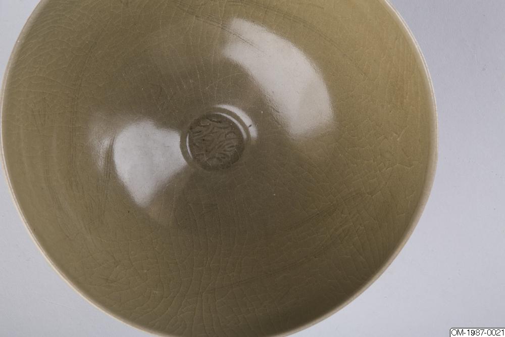 Of almost conic shape, this bowl has a deep cavity; from the upright rim, the sides of the vessel slightly bulge before tapering down to the foot. The foot is high compared to other bowls of the same period. The interior base has a circular impression with an incised pattern, possibly representing grass, on the inside, and the walls are adorned with an incised decoration of three flying parrots, spaced equidistant from each other. Above and below the parrot motifs are bundles of incised lines, probably highly stylized clouds. The bowl is coated in a greenish tinged glaze. On the exterior, the colour ranges from bluish-green to a brownish-olive. These irregularities are caused by uneven firing conditions. The base inside the footrim bears marks from three silica firing supports.