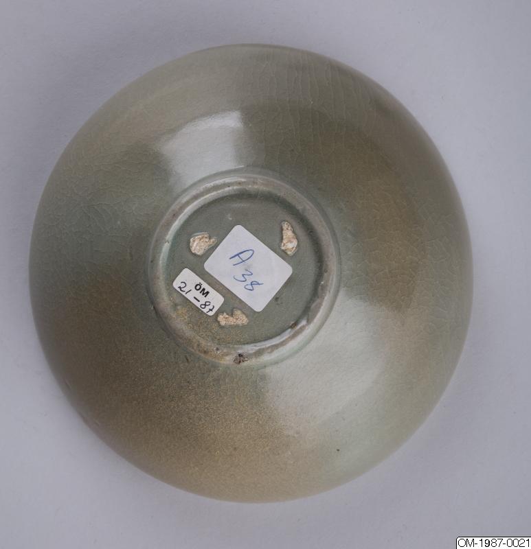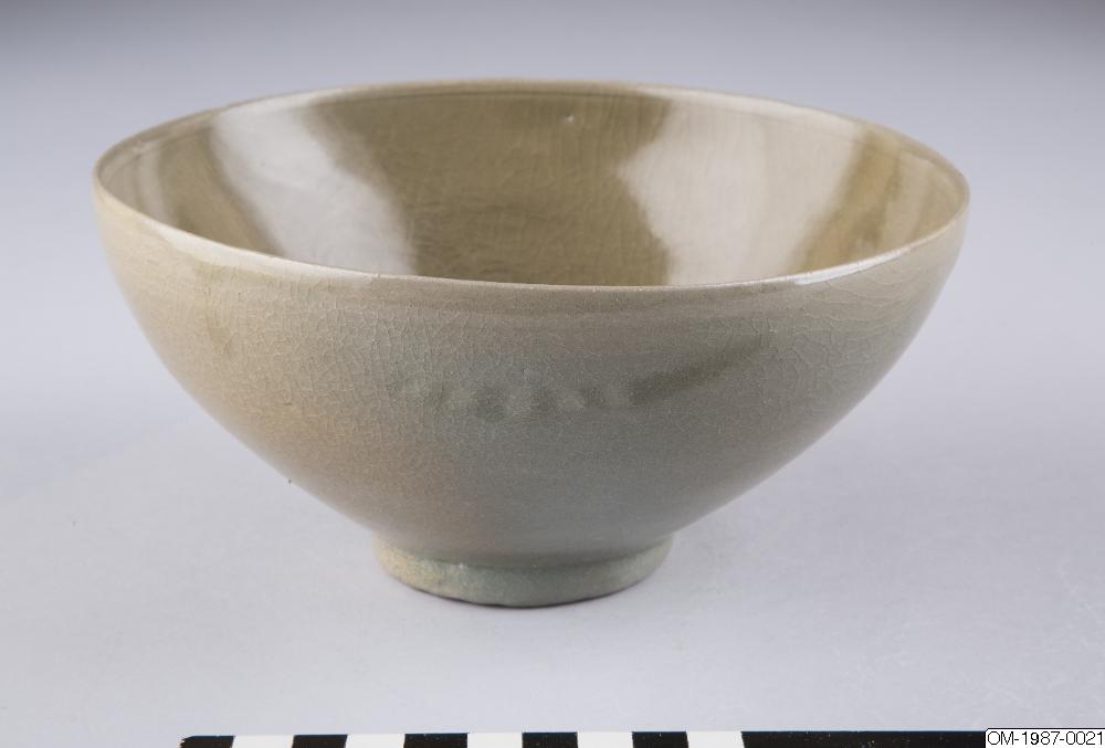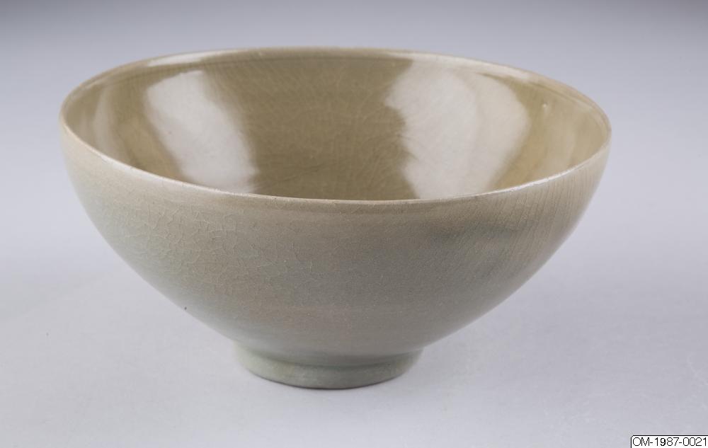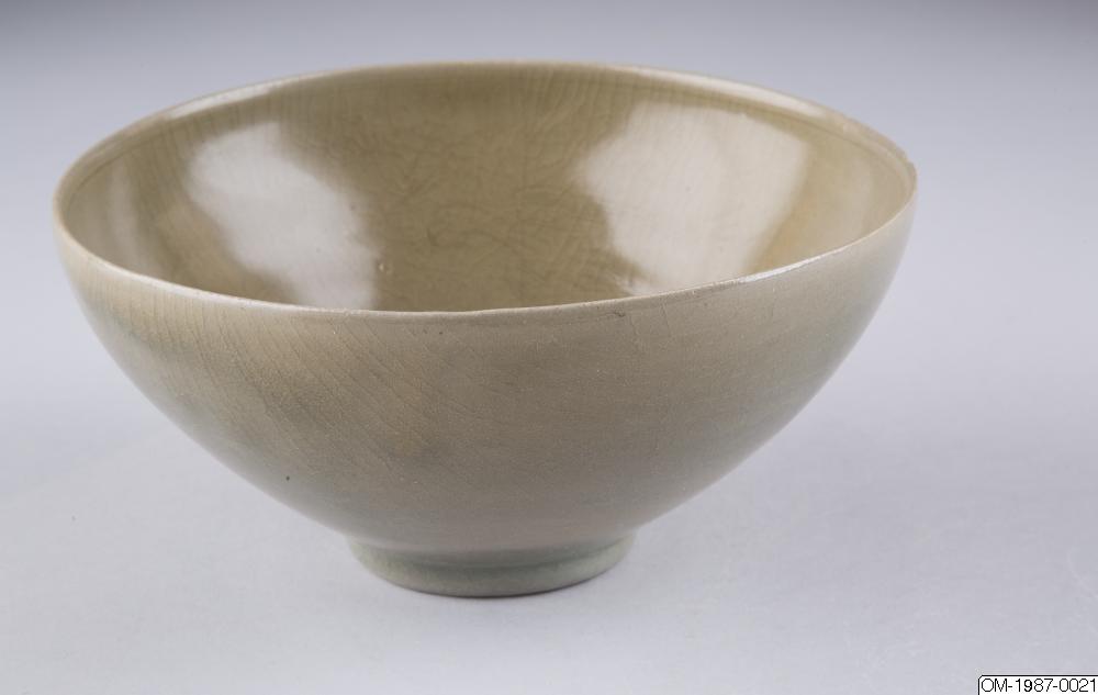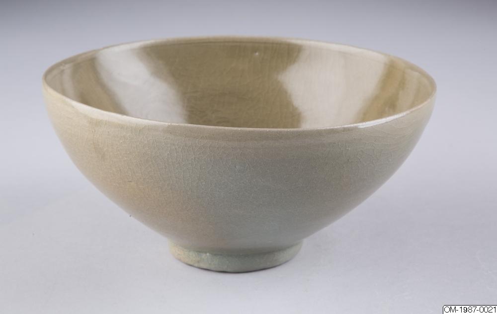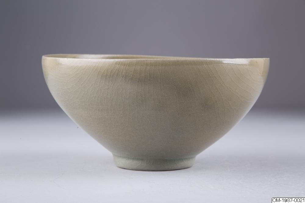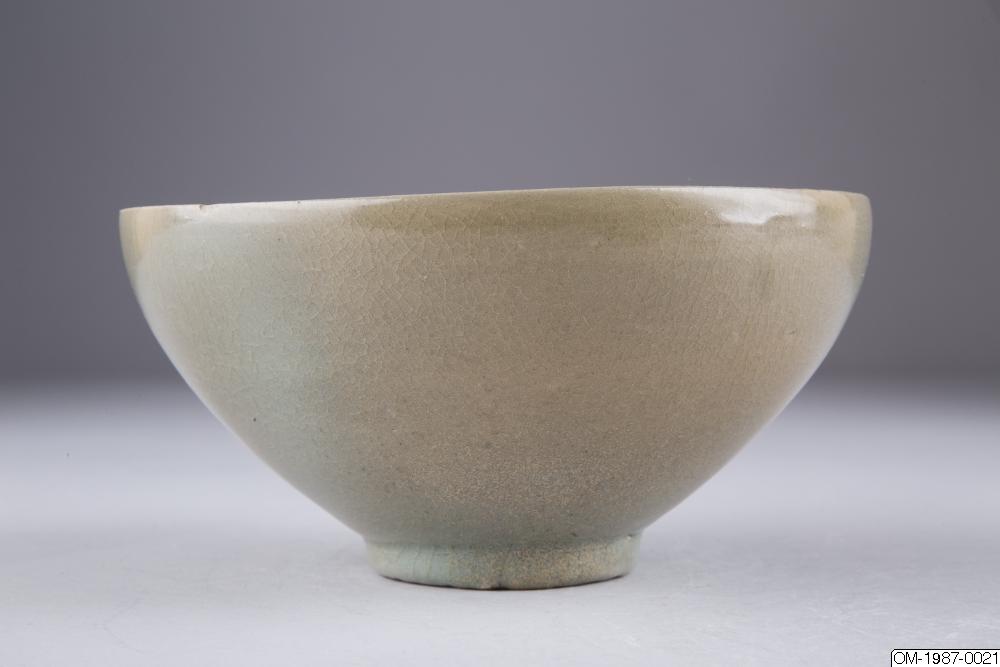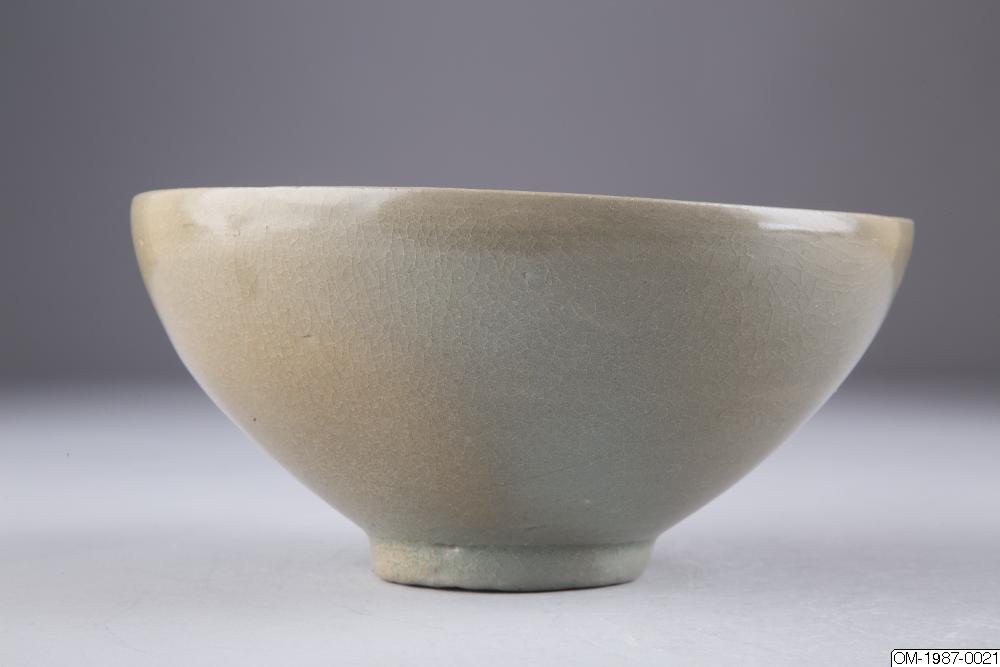 Of almost conic shape, this bowl has a deep cavity; from the upright rim, the sides of the vessel slightly bulge before tapering down to the foot. The foot is high compared to other bowls of the same period. The interior base has a circular impression with an incised pattern, possibly representing grass, on the inside, and the walls are adorned with an incised decoration of three flying parrots, spaced equidistant from each other. Above and below the parrot motifs are bundles of incised lines, probably highly stylized clouds. The bowl is coated in a greenish tinged glaze. On the exterior, the colour ranges from bluish-green to a brownish-olive. These irregularities are caused by uneven firing conditions. The base inside the footrim bears marks from three silica firing supports.